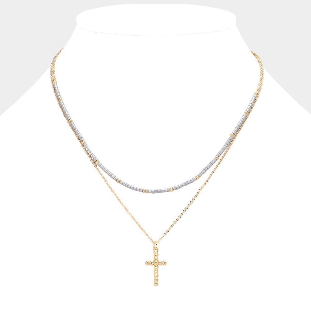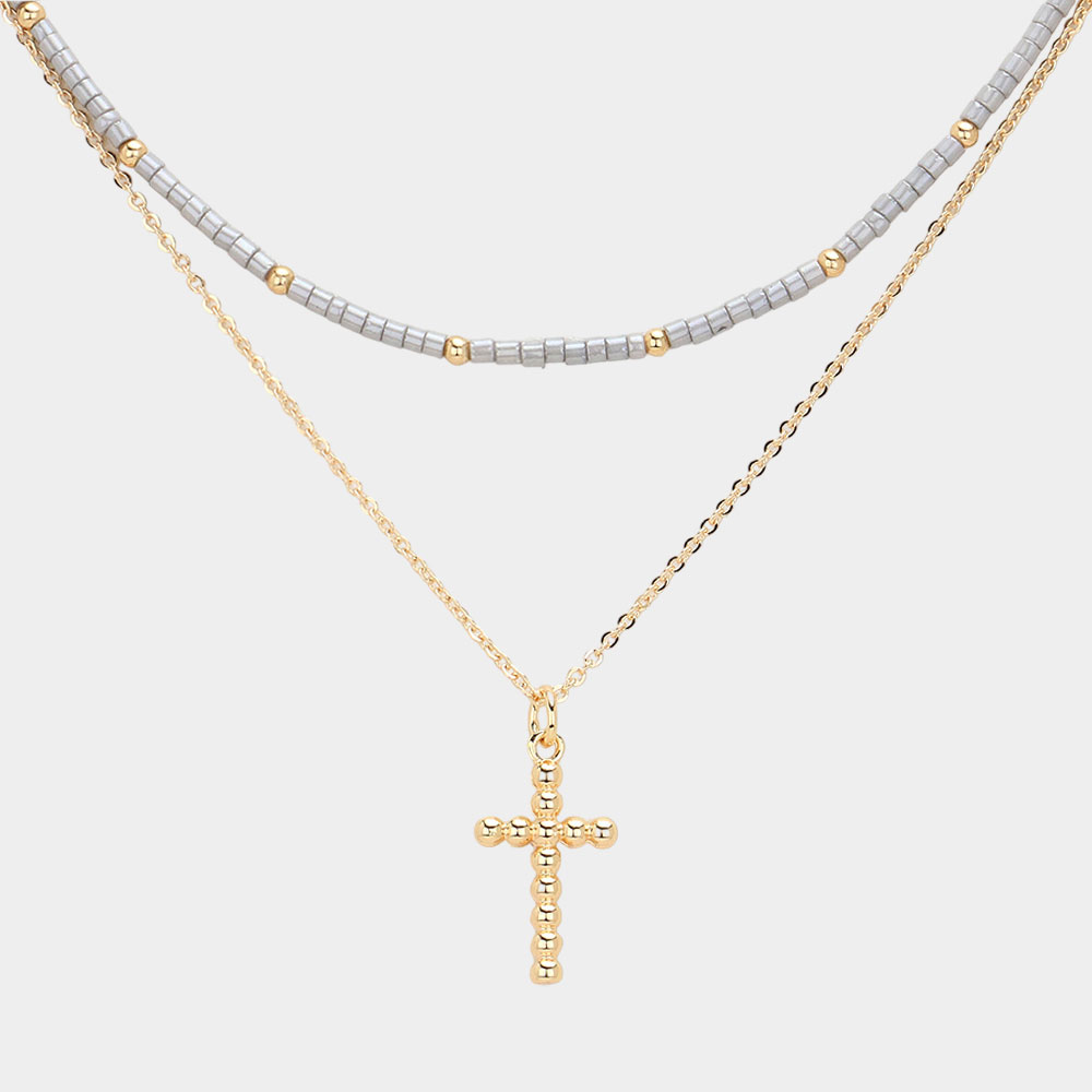 Metal Ball Cross Pendant Seed Beaded Double Layered Necklace