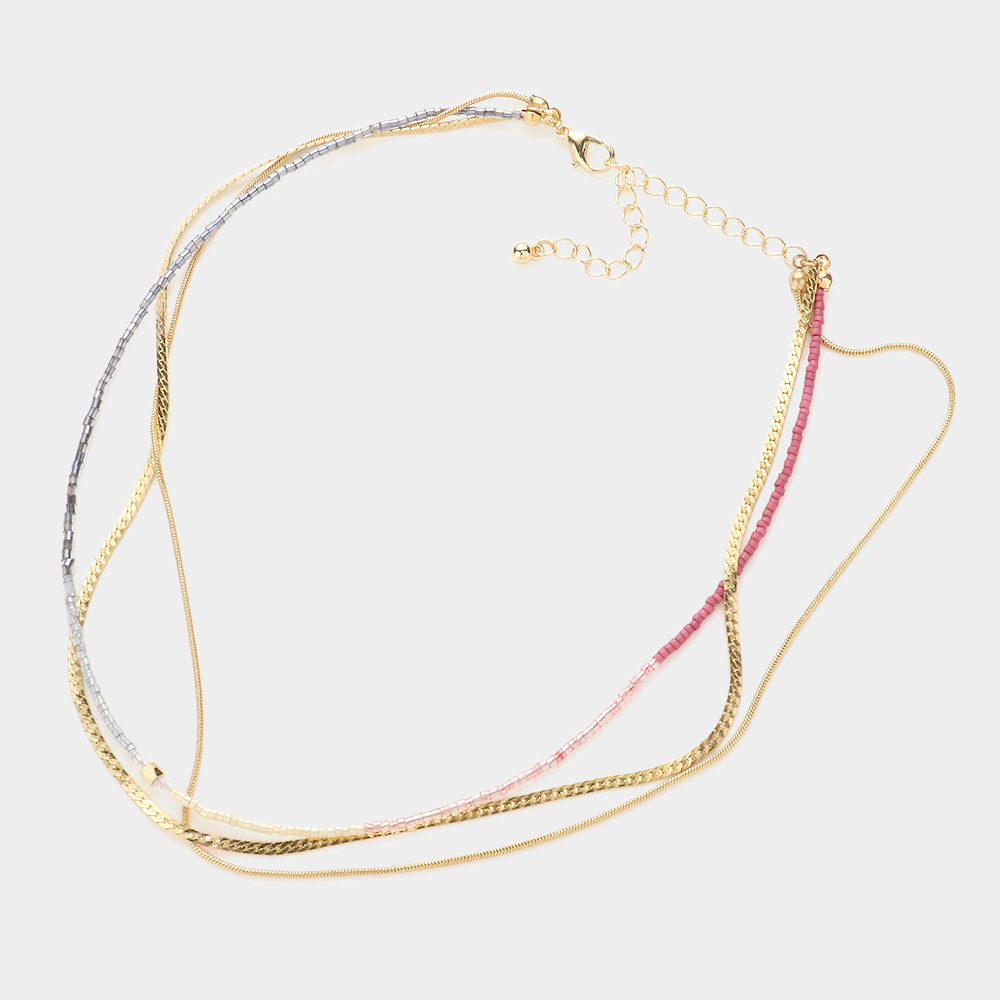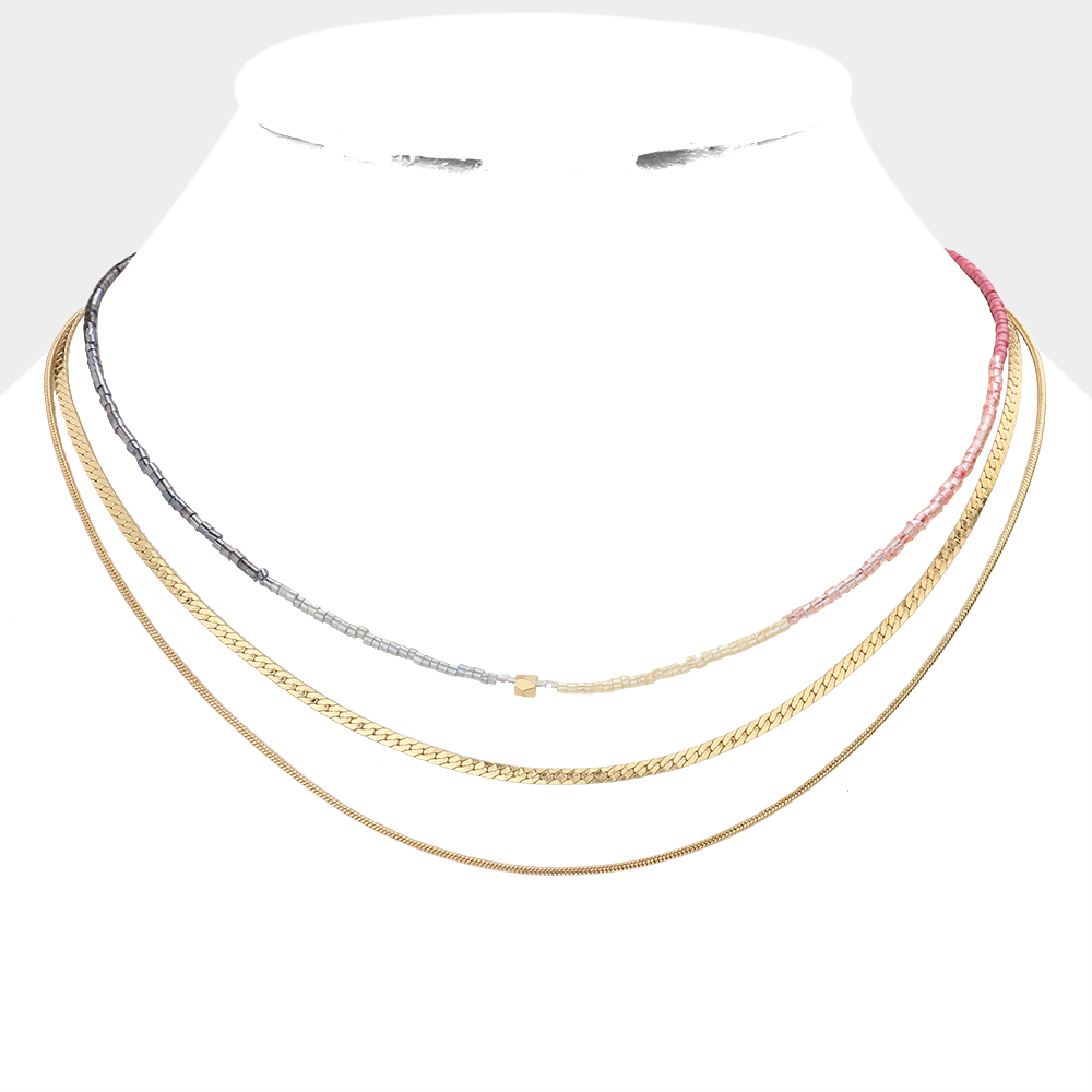 3PCS - Metal Chain Flower Accented Beaded Necklaces