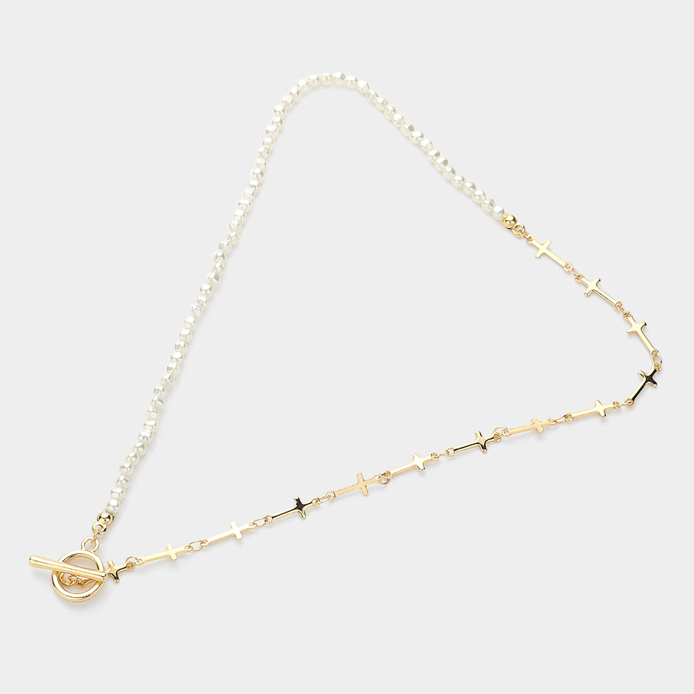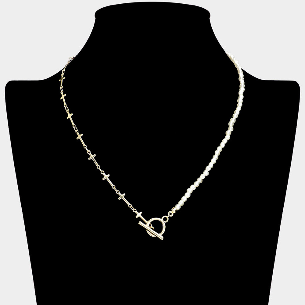 Stone Paved Cross Pendant Accent Double Layered Chain Necklace