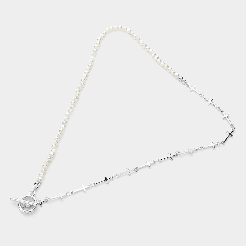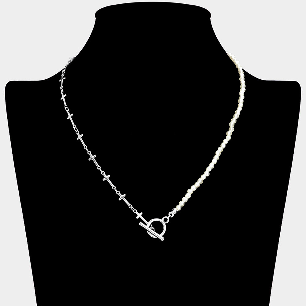 Metal Cross Link Pearl Toggle Necklace