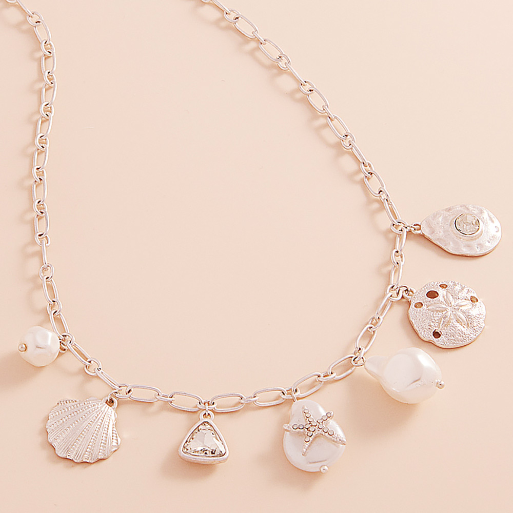Metal Seashell Sand Dollar Pearl Starfish Charm Station Necklace