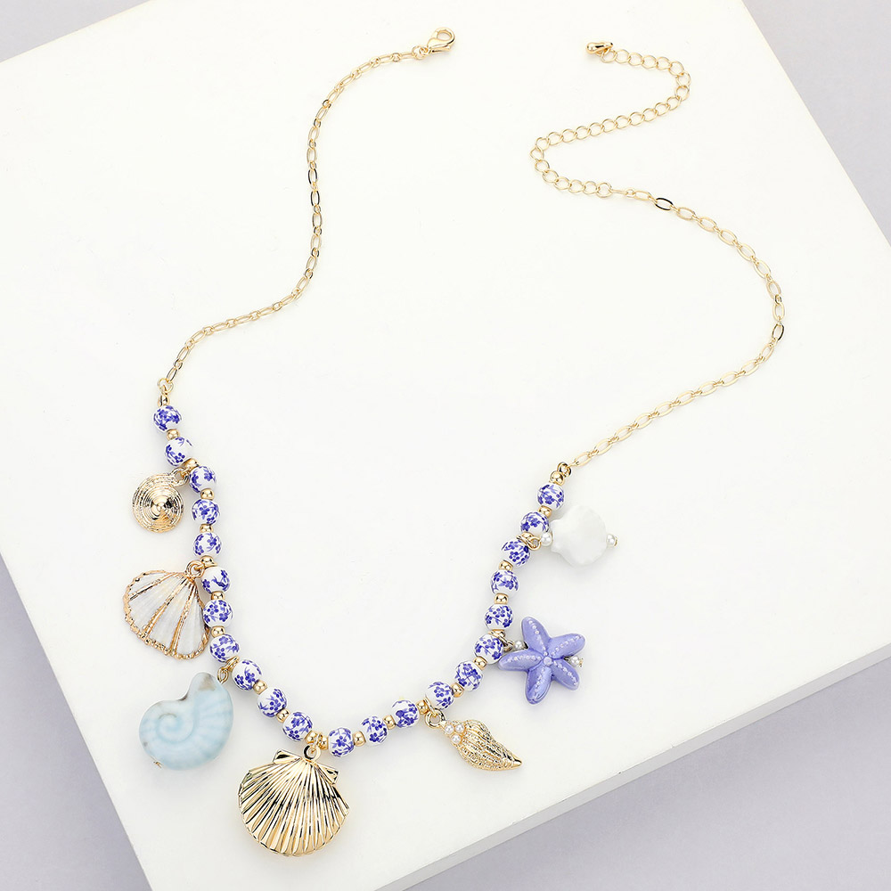 Metal Shell Locket Puka Shell Ceramic Starfish Sealife Charm Station Ceramic Ball Beaded Necklace