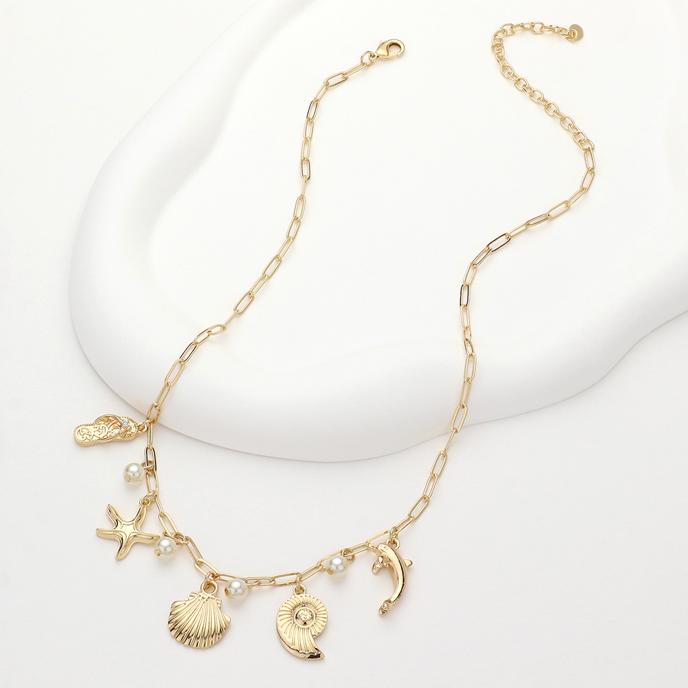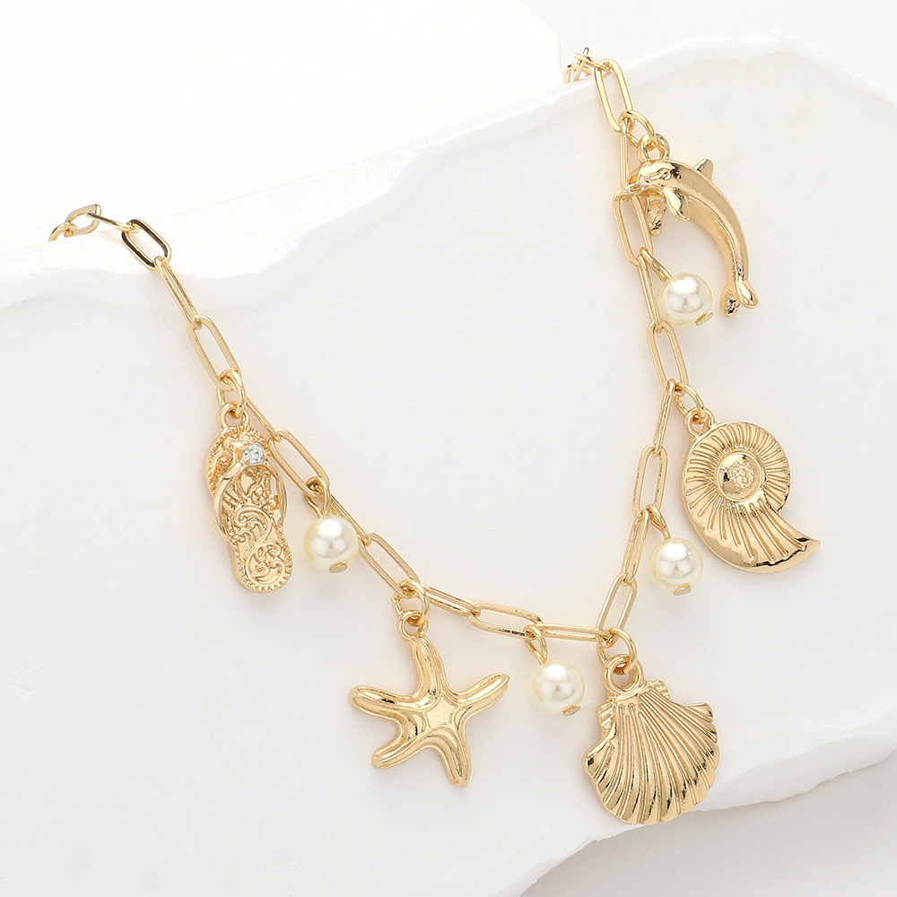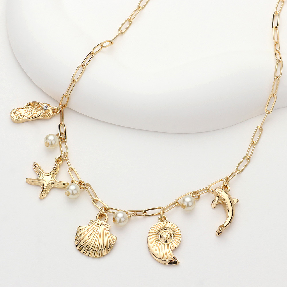 Metal Shell Starfish Flip Flop Dolphin Pearl Charm Station Textured Paperclip Chain Necklace