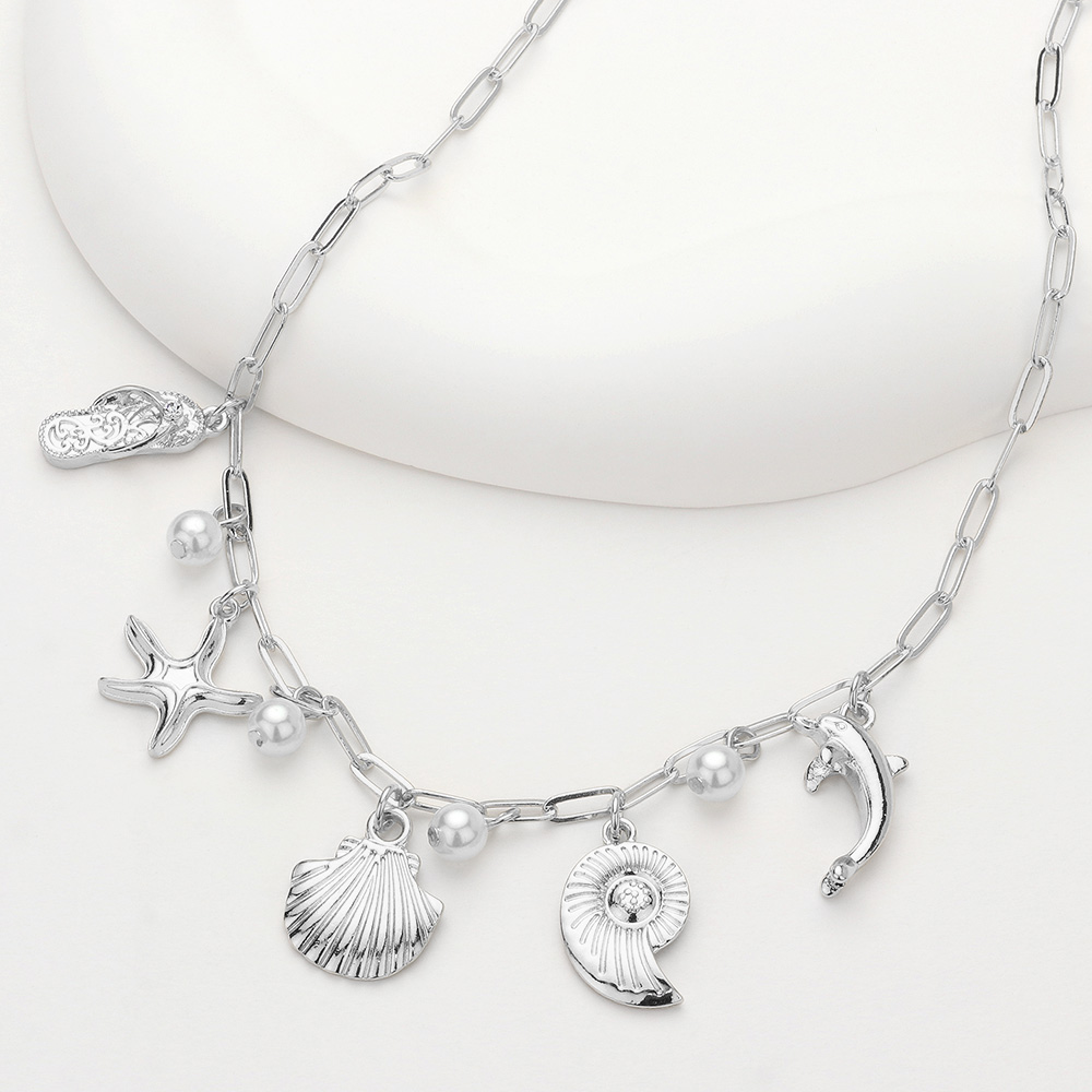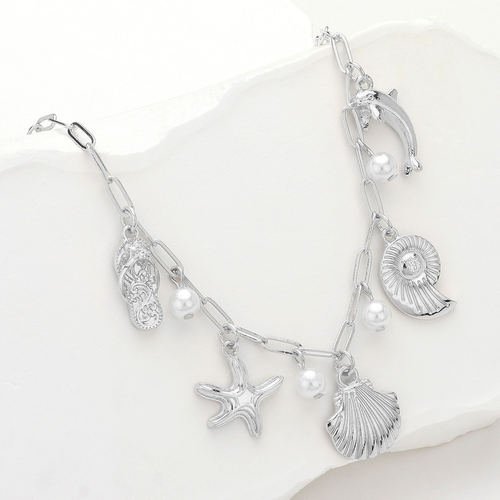 Metal Shell Starfish Flip Flop Dolphin Pearl Charm Station Textured Paperclip Chain Necklace