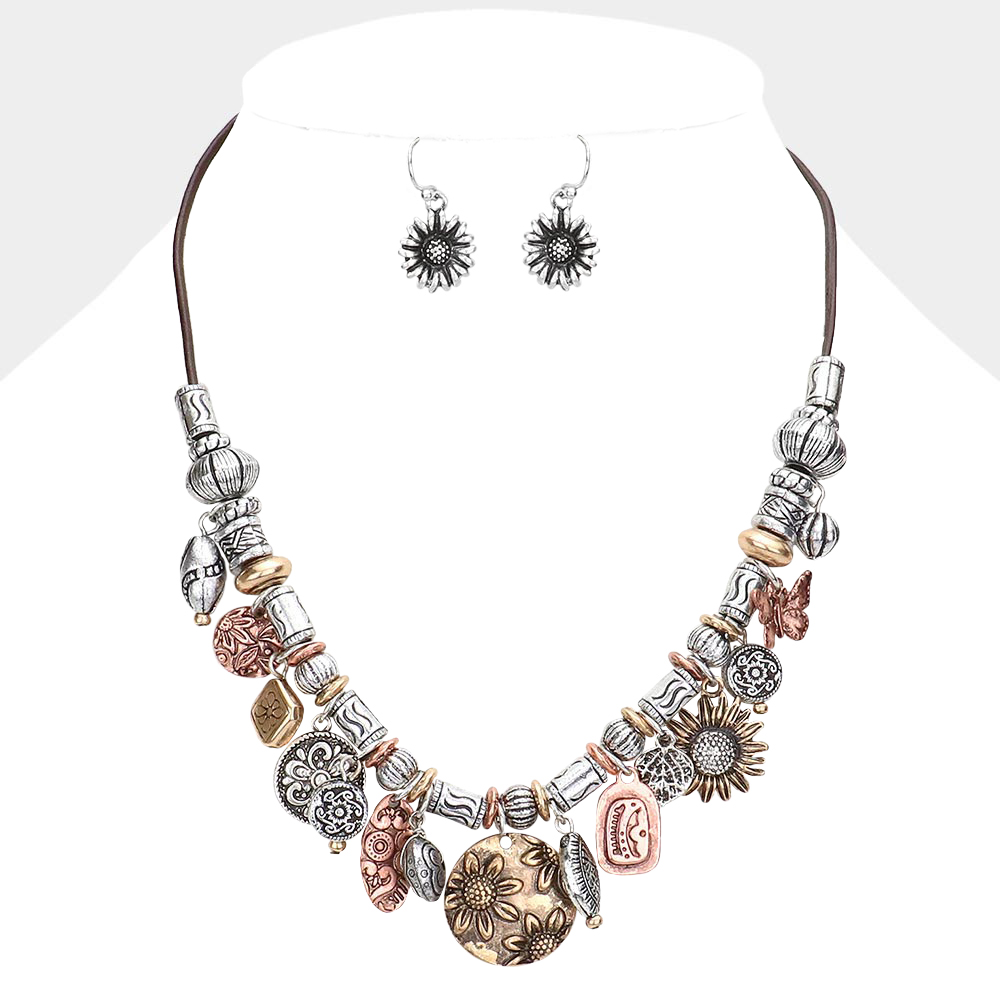 Metal Sunflower Butterfly Antique Pendant Cluster Necklace