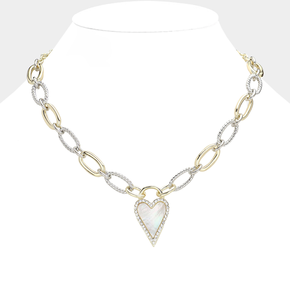 Mother Of Pearl Heart Pendant 14K Gold Plated Two Tone Chain Link Toggle Necklace