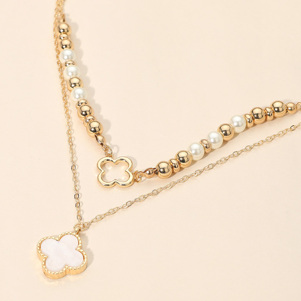 Details • Necklace Size : 16" + 3" L • Decor Size : 3" L • Pendant Size : 0.7" X 0.7" • Elegant layered necklace featuring beaded details and dual quatrefoil pendants for a refined, on-trend look. Designed to style beautifully alone or with other chains, it adds subtle charm to everyday outfits, evening ensembles, or thoughtful gift selections for any occasion. • Lead and Nickel Compliant