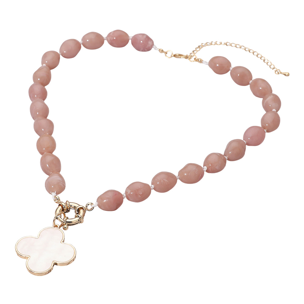 Details • Necklace Size : 16.5" + 3.5" L • Decor Size : 2" L • Charming beaded necklace featuring smooth round beads and a mother of pearl quatrefoil-shaped pendant for a refined, stylish look. Perfect for casual or dressy outfits, adding a touch of sophistication and personality. A versatile accessory that blends modern elegance with timeless appeal. • Lead and Nickel Compliant
