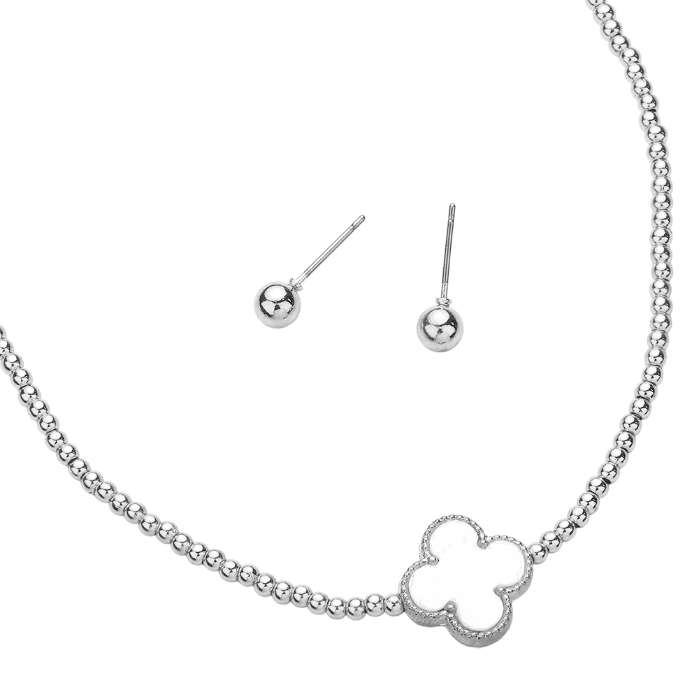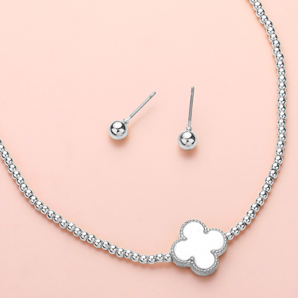 Mother Of Pearl Quatrefoil Pendant Pointed Metal Ball Beaded Necklace