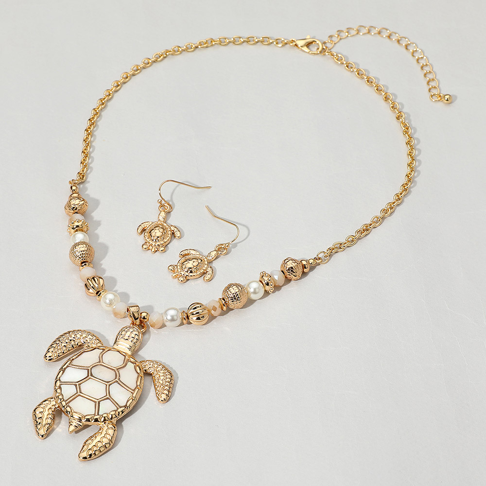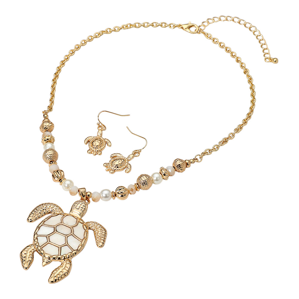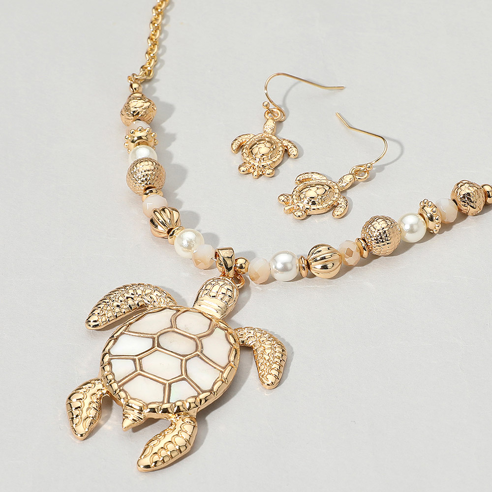 Details • Necklace Size : 17" + 3" L • Decor Size : 0.3" L • Pendant Size : 1.8" X 2.6" • Earrings Size : 1.25" L • Charming jewelry set featuring a turtle pendant necklace and matching earrings with decorative beads. A fun, beachy accessory ideal for casual wear or adding a playful touch to your everyday style. • Lead and Nickel Compliant