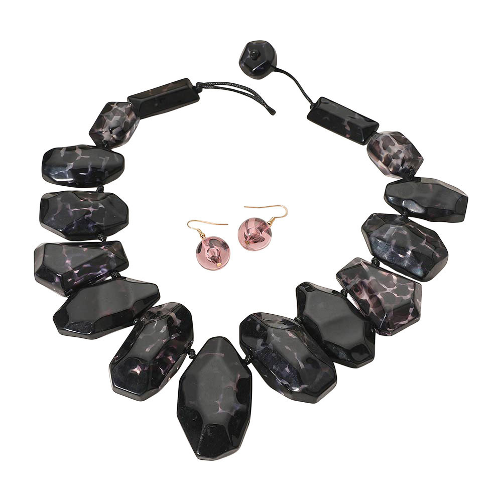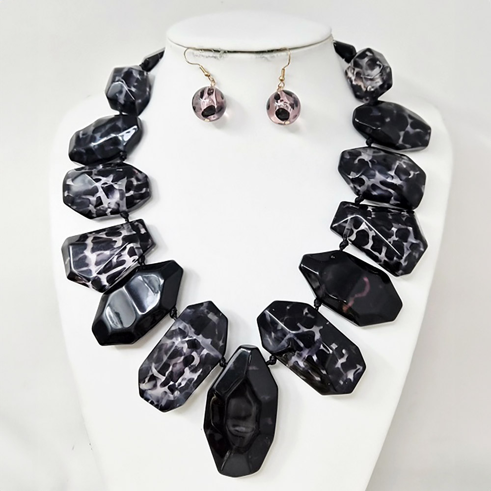 • Bold faceted necklace and matching earrings set with oversized geometric beads. This eye-catching duo is perfect for adding drama to evening looks or elevating any outfit with striking, sculptural style.