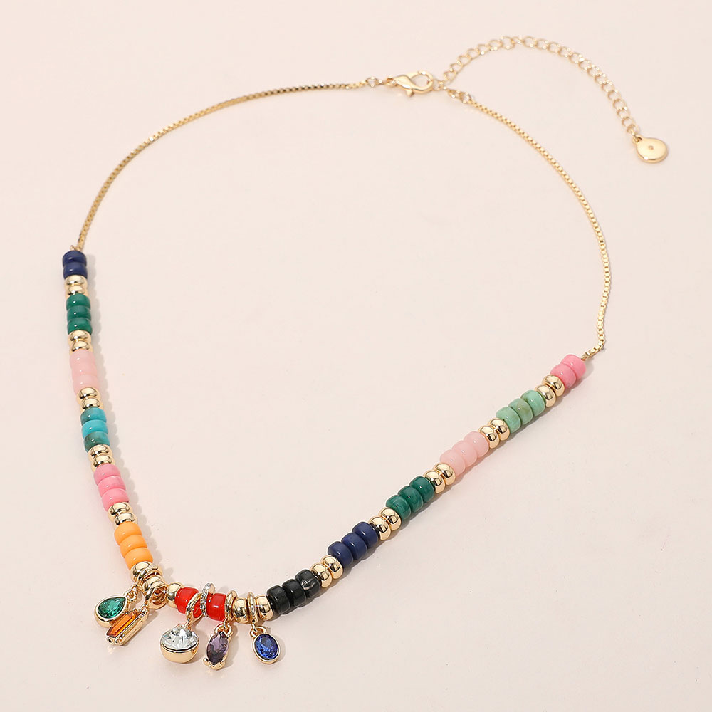 Details • Necklace Size : 16" + 3.5" L • Decor Size : 0.8" L • Add a pop of color to your look with this multicolor bead pendant necklace, featuring vibrant beads in pastel and bold hues. Decorated with stylish gold accents and a selection of colorful gemstone charms, it’s the perfect accessory for both casual and dressy occasions. • Lead and Nickel Compliant