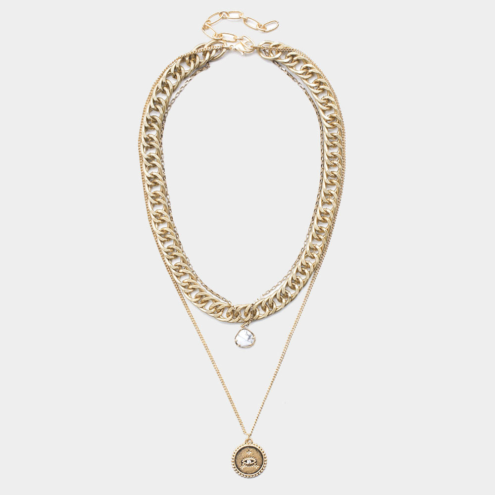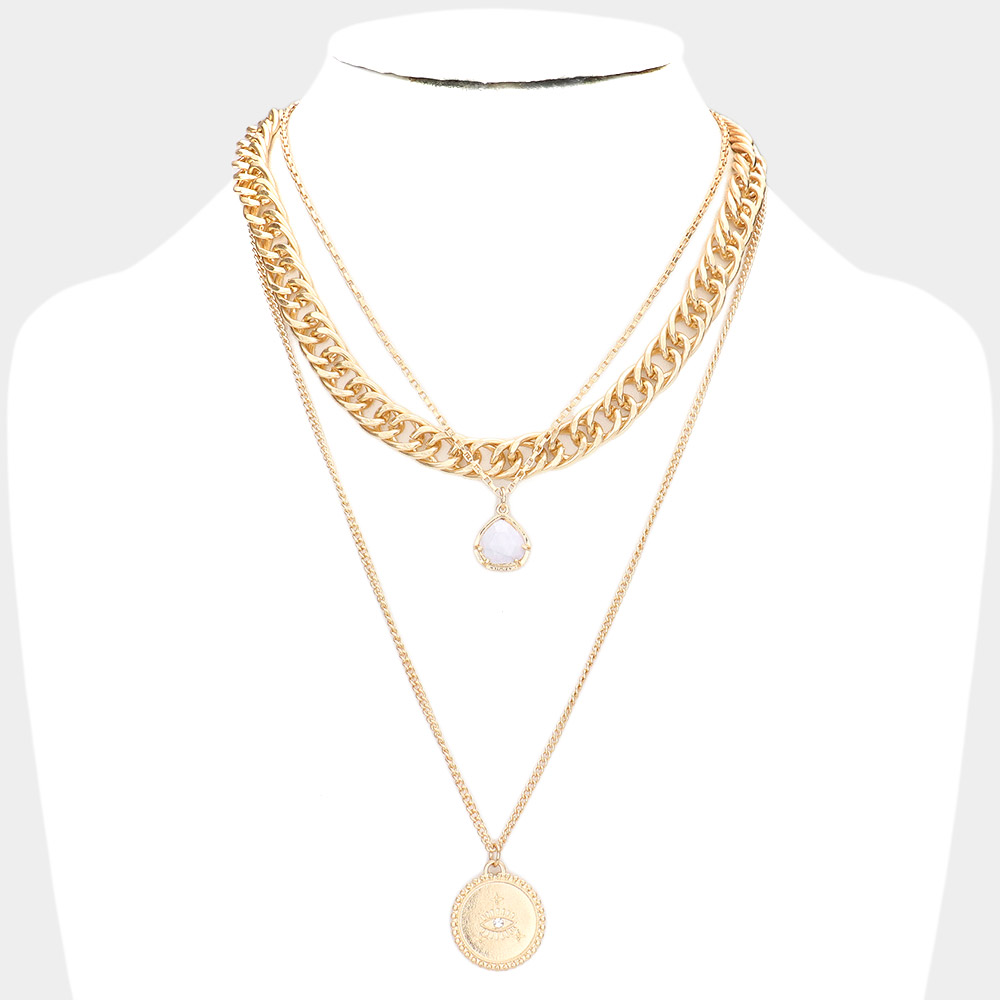 Natural Stone Evil Eye Detailed Metal Round Pendant Triple Layered Necklace