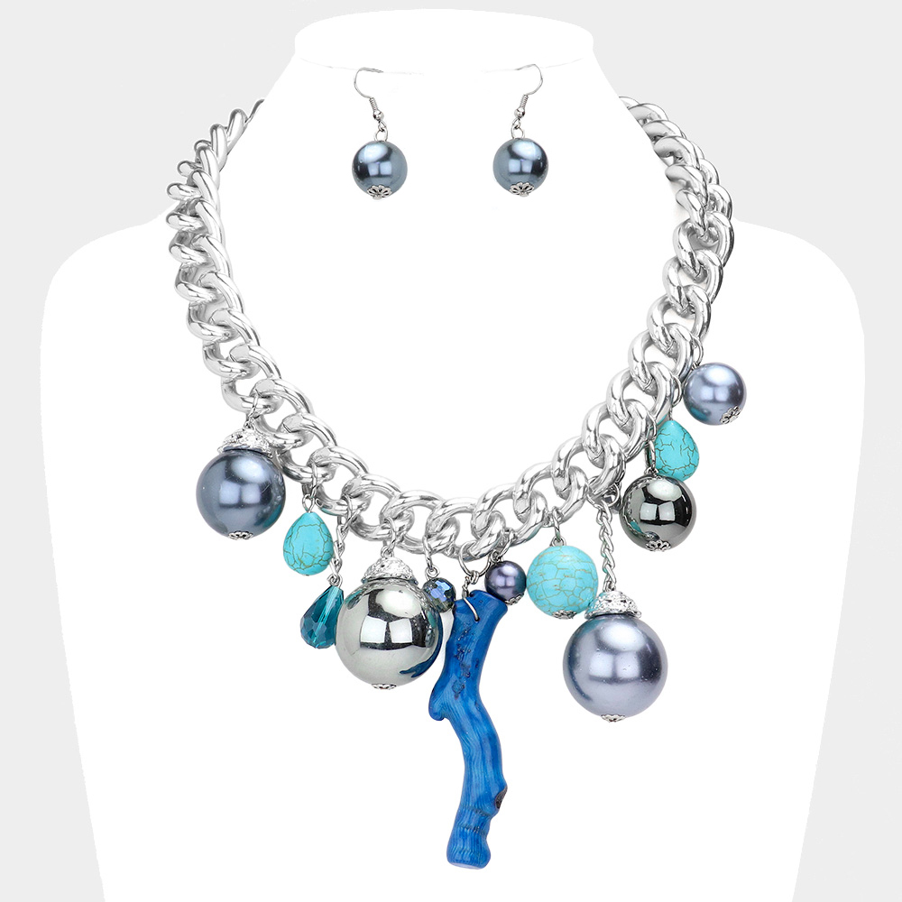 Natural Stone Metal Ball Pearl Coral Link Statement Necklace