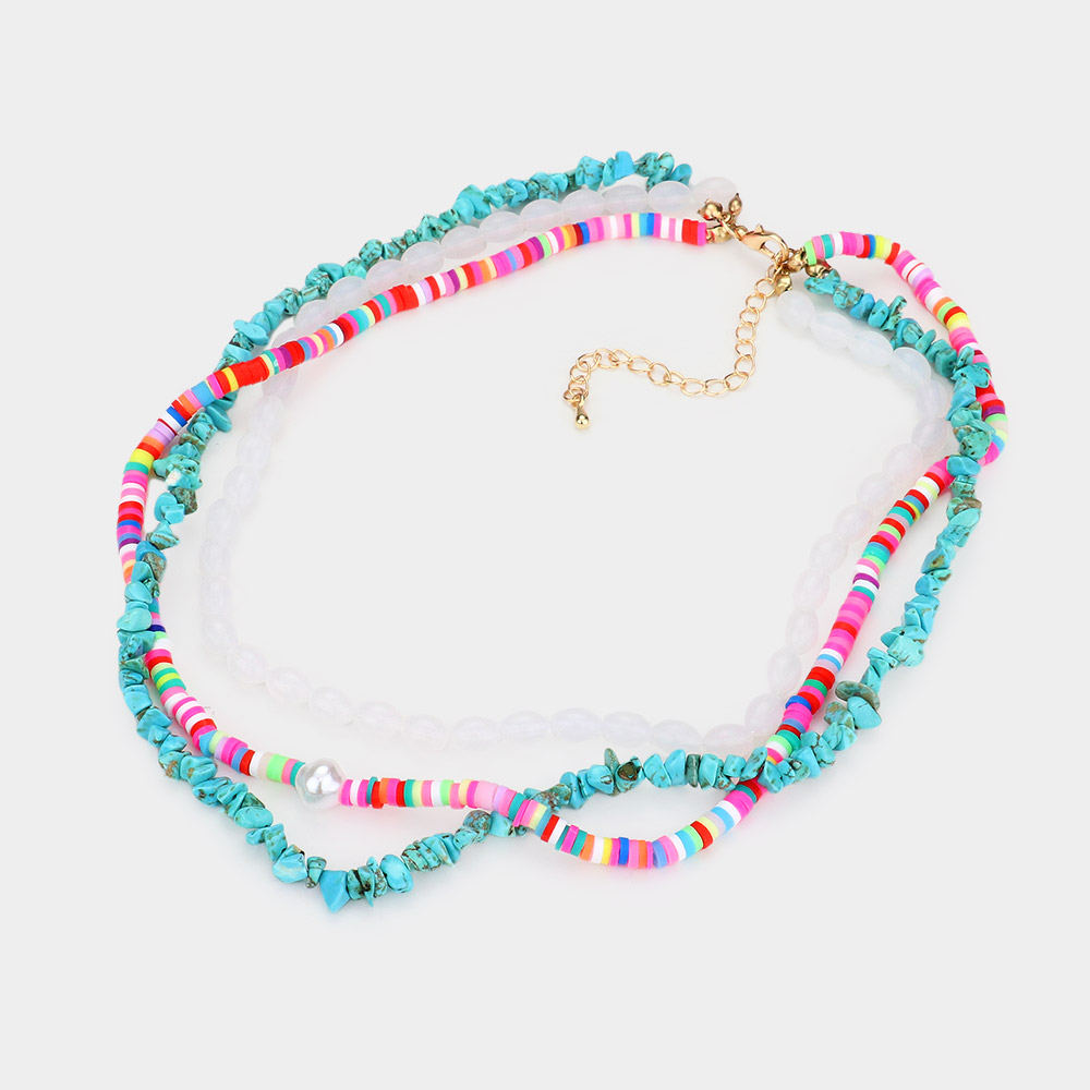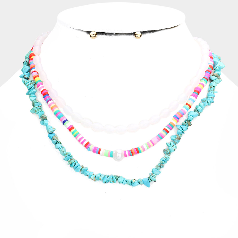 Natural Stone Oval Heishi Beaded Triple Layered Necklace