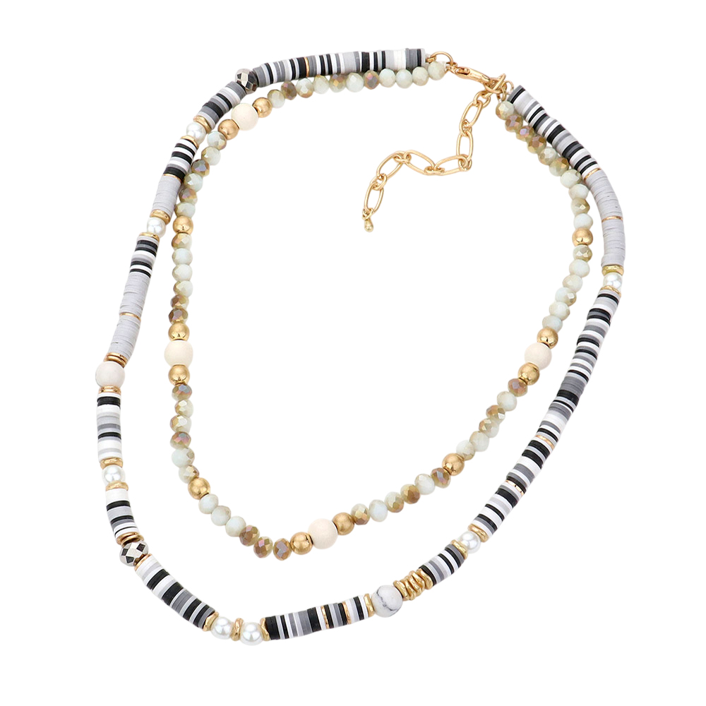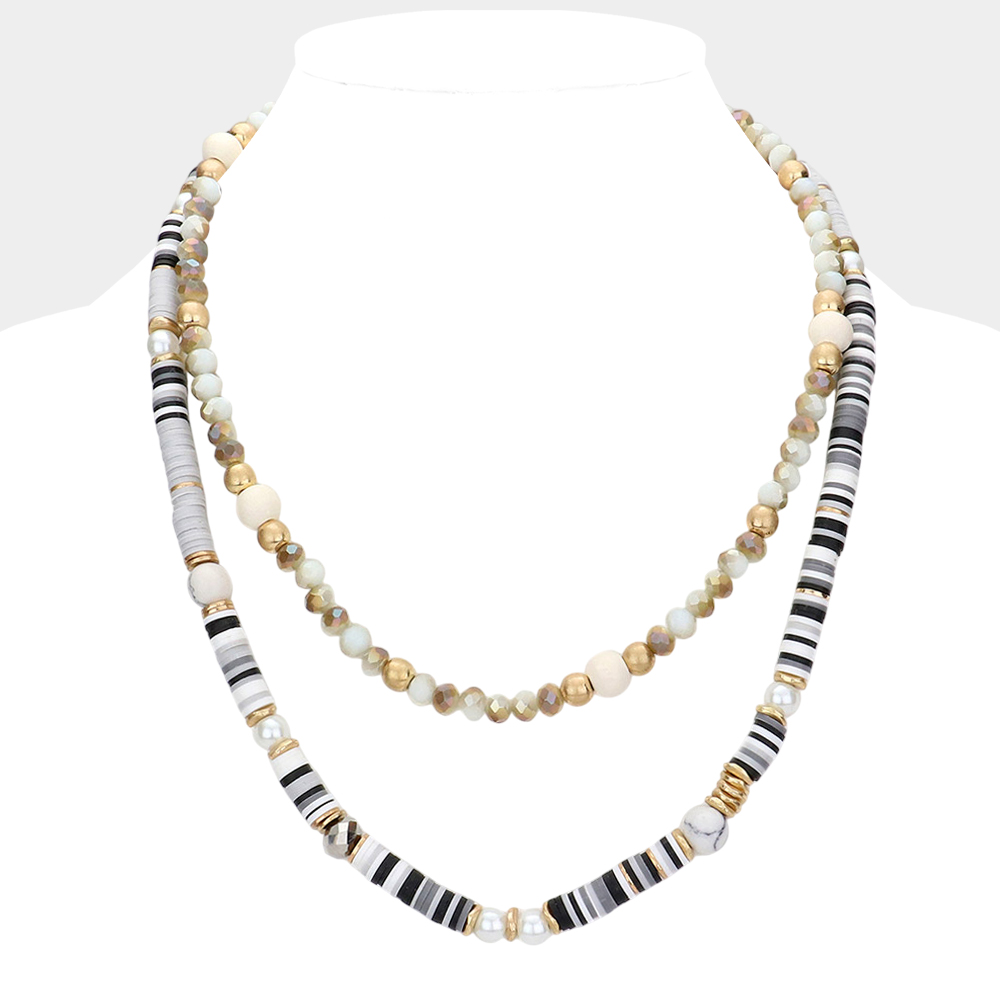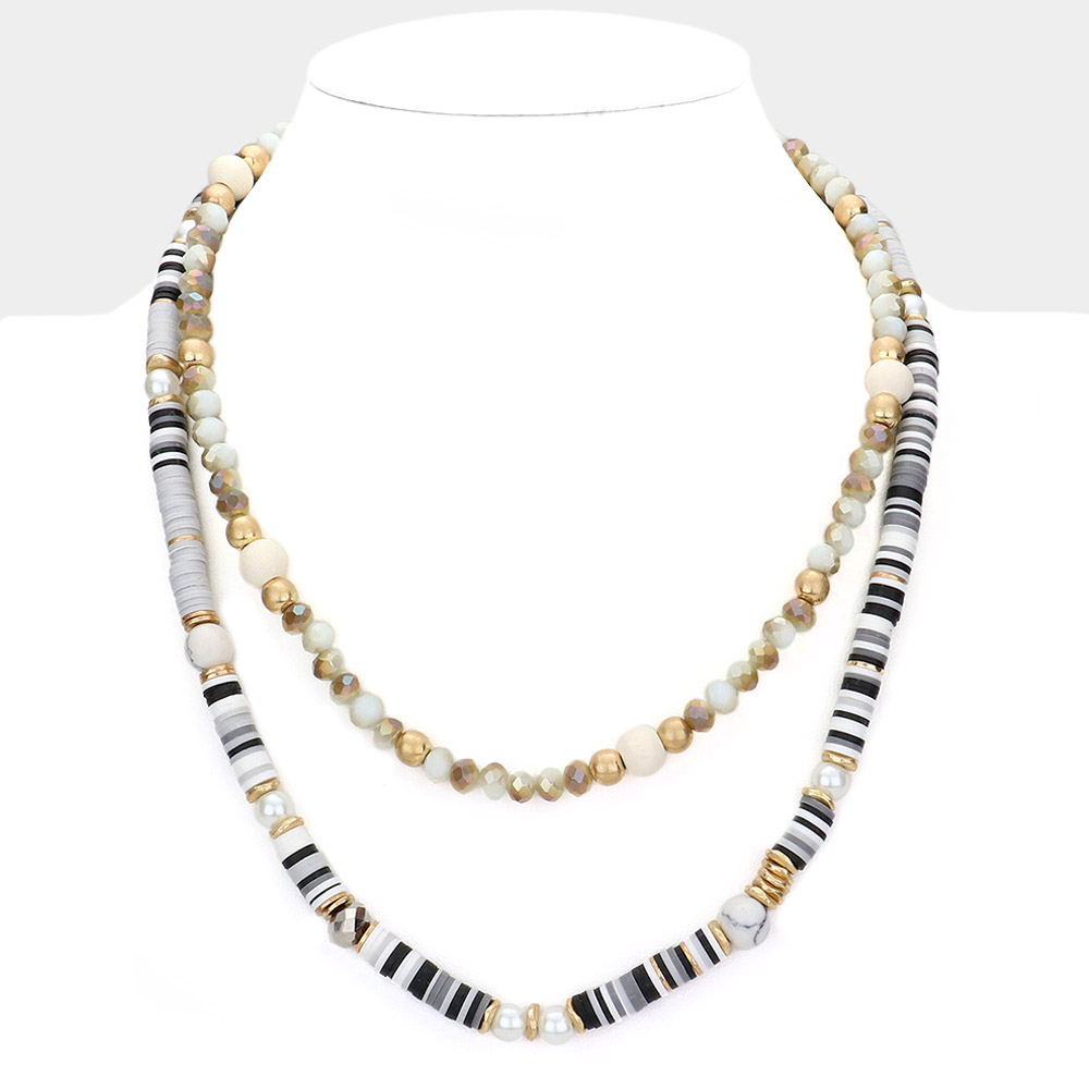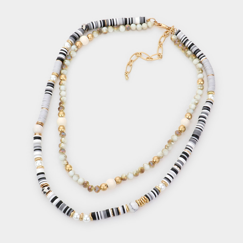 Natural Stone Pearl Wood Pointed Faceted Heishi Beaded Double Layered Necklace