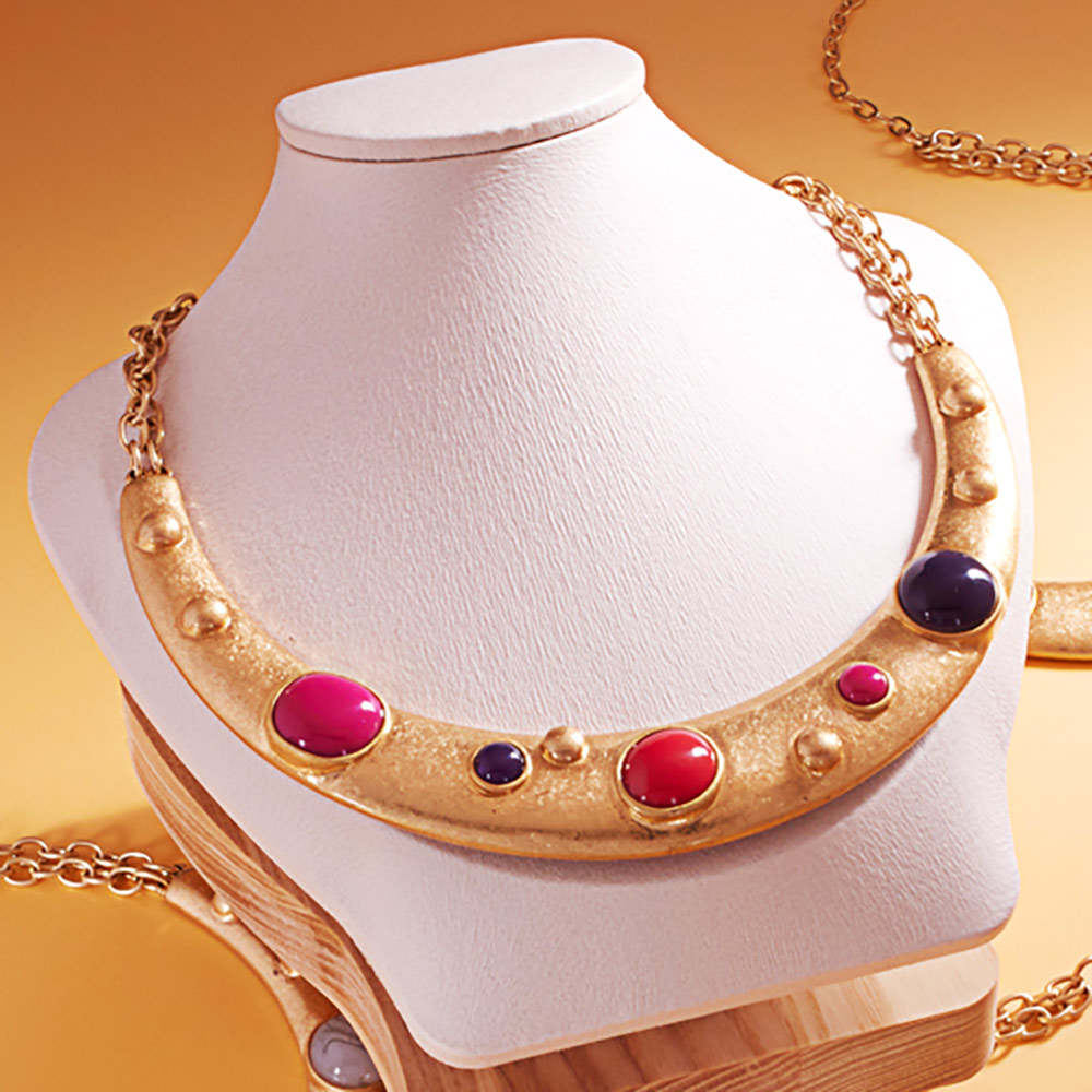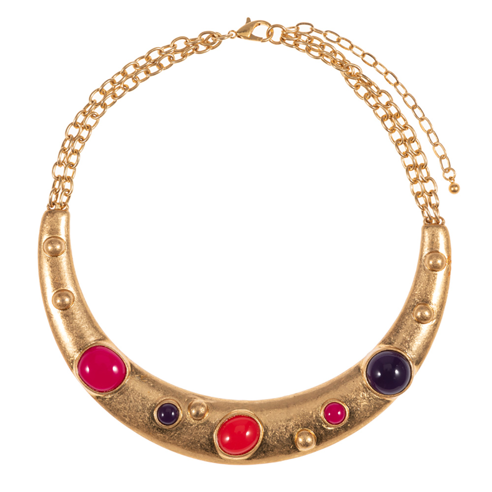 Details • Necklace Size : 15.5" + 3.25" L, 4.6" D • Decor Size : 0.8" L • Stylish collar necklace featuring a textured metal base adorned with round resin details and a secure chain. A bold, artistic accessory perfect for enhancing modern and boho-inspired outfits with unique flair. Ideal for standout everyday or evening looks. • Lead and Nickel Compliant