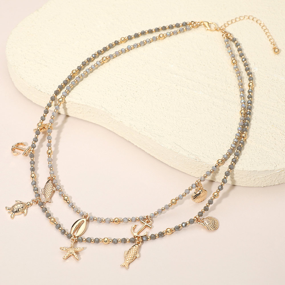 • This layered beaded necklace features charming ocean-inspired pendants including seashells, fish, and anchors. A stylish accessory that brings a touch of coastal elegance to your look, perfect for adding playful detail to everyday or vacation outfits.