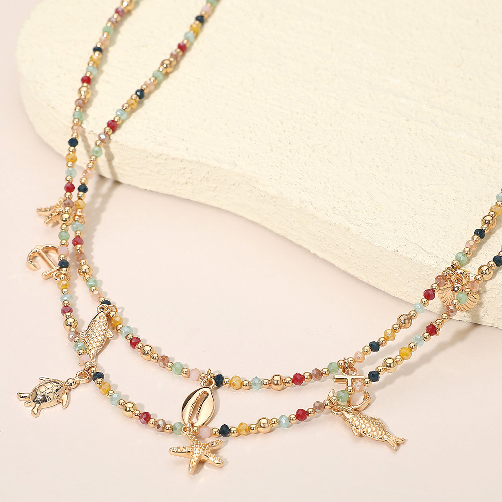 Details • Necklace Size : 16.5" + 3" L • Decor Size : 2" L • This layered beaded necklace features charming ocean-inspired pendants including seashells, fish, and anchors. A stylish accessory that brings a touch of coastal elegance to your look, perfect for adding playful detail to everyday or vacation outfits. • Lead and Nickel Compliant