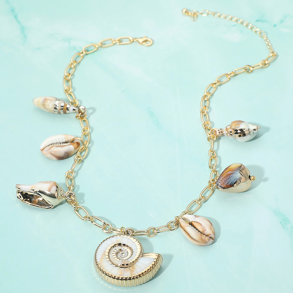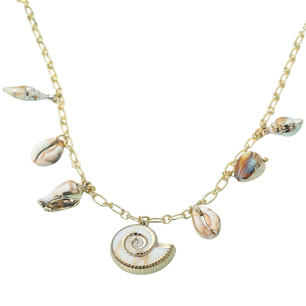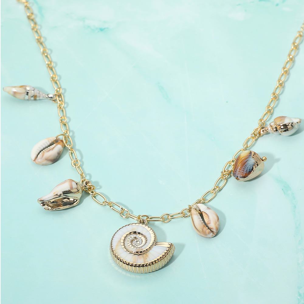 Details • Necklace Size : 16" + 3.25" L • Decor Size : 1.75" L • Capture coastal elegance with this seashell charm necklace. Featuring detailed shell pendants on a delicate chain, it adds a breezy beach vibe to any outfit. Perfect for summer getaways, vacations, or everyday seaside-inspired style. • Lead and Nickel Compliant