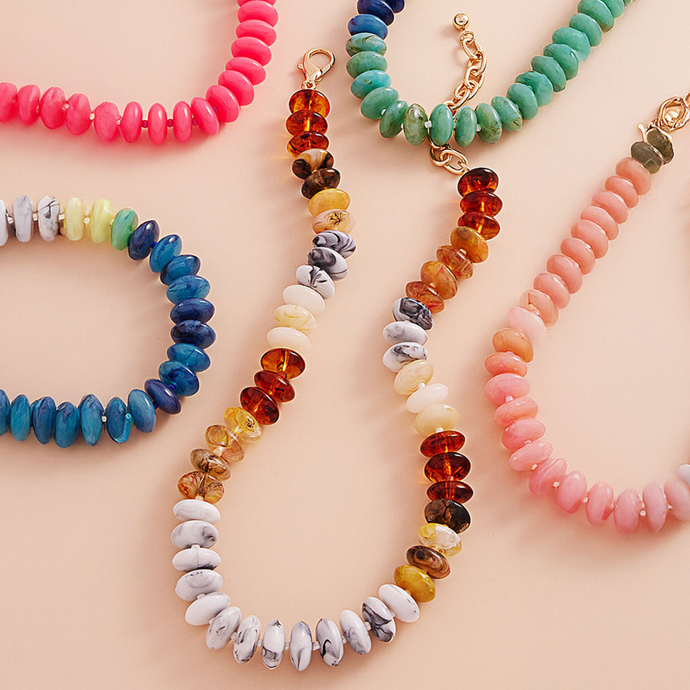 • Vibrant disc bead necklace featuring a stunning mix of marbled and bright tones. Perfect for adding a fun and bold touch to your casual or beach-inspired outfits. Lightweight and easy to style.