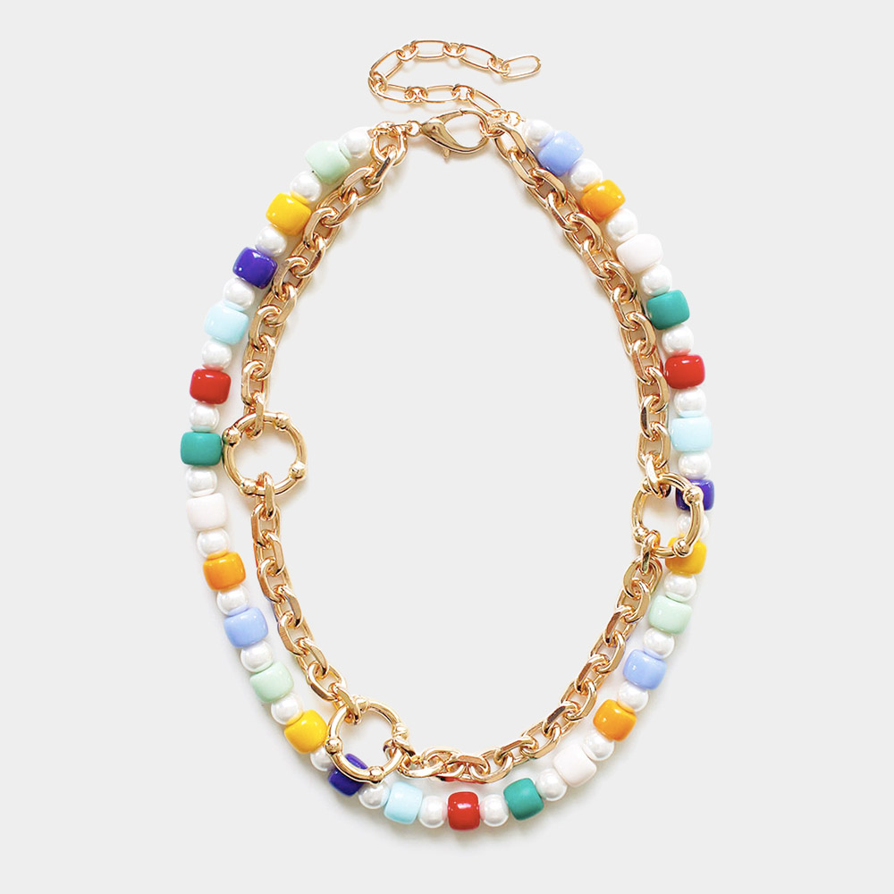 Open Metal Circle Accented Pearl Resin Beaded Double Layered Necklace