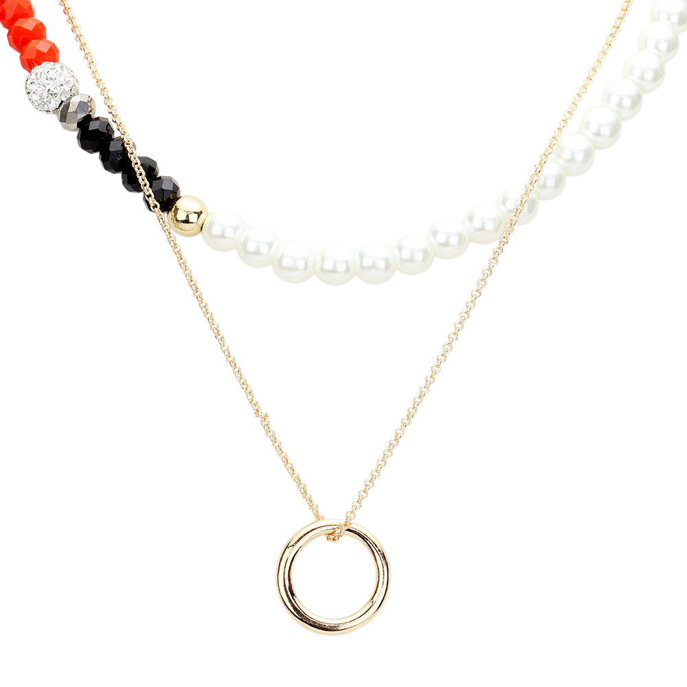 Open Metal Circle Accented Pearl Resin Beaded Double Layered Necklace