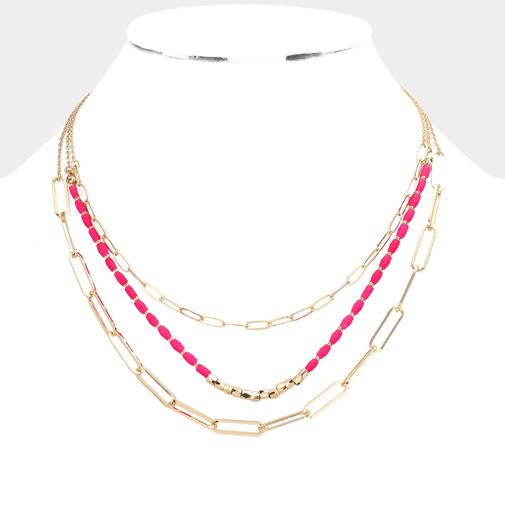 Open Metal Oval Link Faceted Rectangle Beaded Triple Layered Necklace