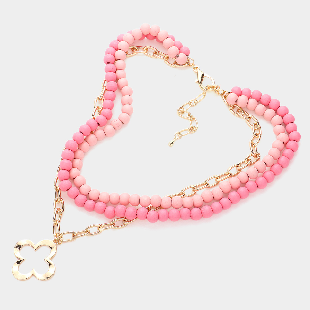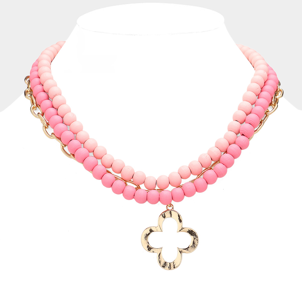 Open Quatrefoil Pendant Pointed Wood Metal Chain Layered Necklace