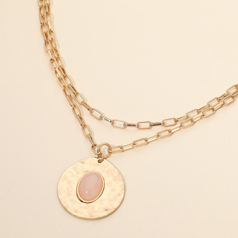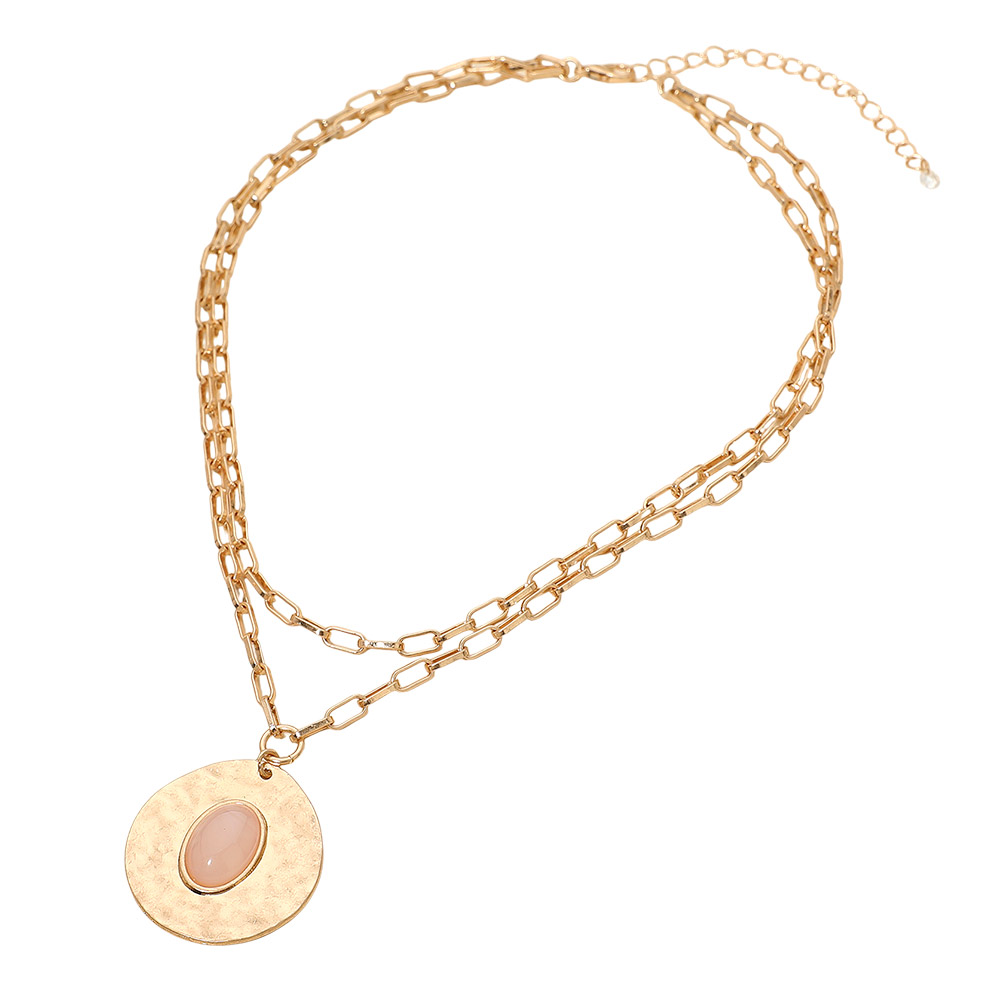 Details • Necklace Size : 15.5" + 3" L • Decor Size : 2" L • Pendant Size : 1.25" X 1.25" • A layered chain necklace featuring a round hammered-look pendant with a soft, polished centerpiece. Its double-chain silhouette adds dimension and elegance, creating a refined accessory that complements both everyday outfits and elevated looks with subtle, modern charm. • Lead and Nickel Compliant