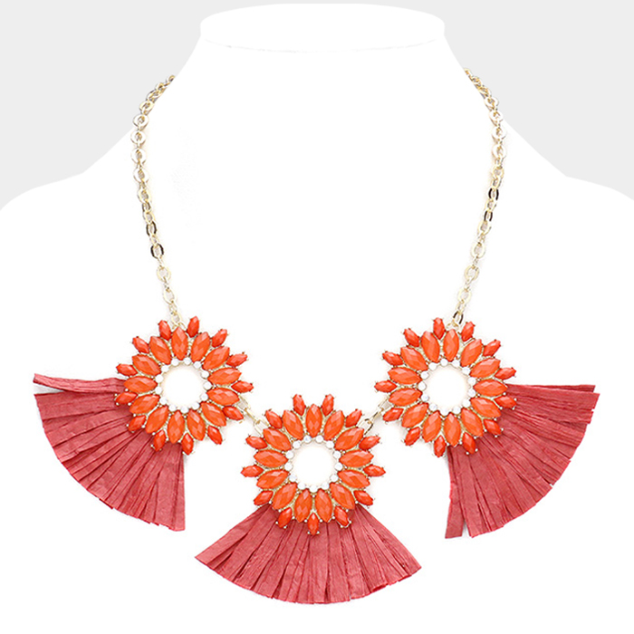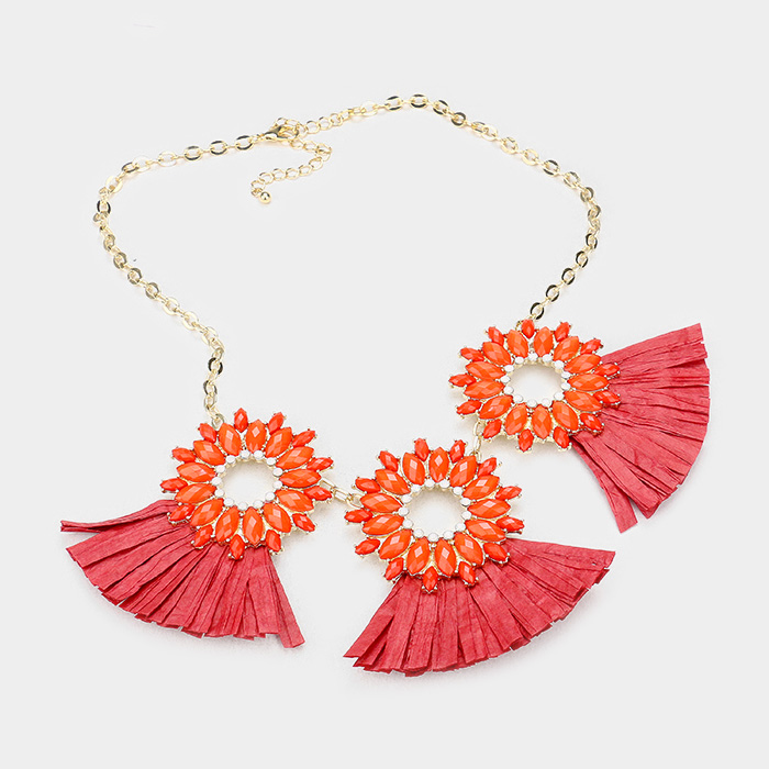 Oval Stone Cluster Hoop Raffia Fringe Statement Bib Necklace