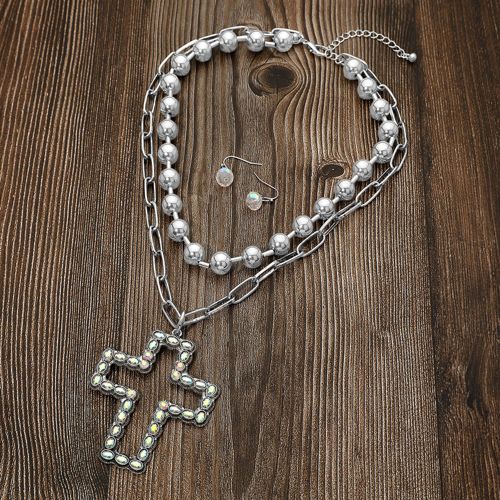Details • Necklace Size : 18" + 3" L • Decor Size : 6" L • Earrings Size : 1" L • Statement necklace and earring set featuring a bold layered chain with a shimmering cross pendant, perfect for adding edge and style to any outfit. Designed to stand out, this set blends modern chain detail with eye-catching pendant accents for a striking look. • Lead and Nickel Compliant