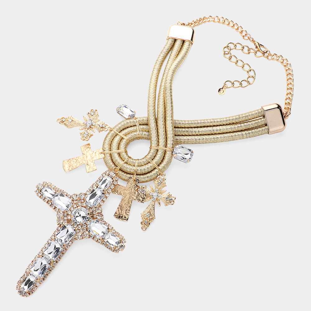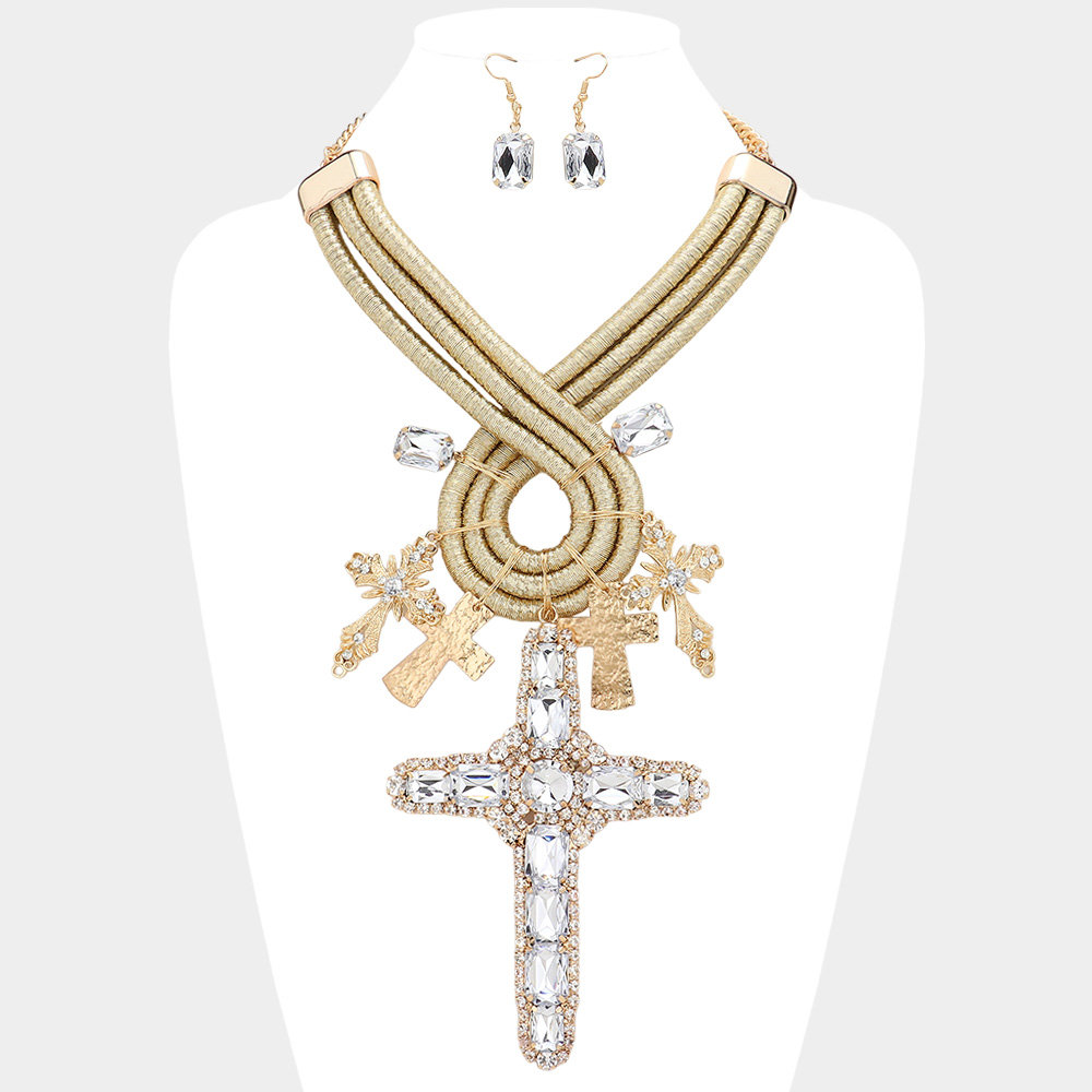 Oversized Stone Embellished Cross Pendant Accented Abstract Metal Wire Statement Necklace