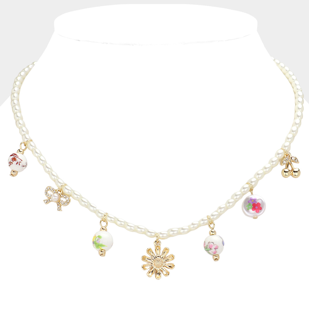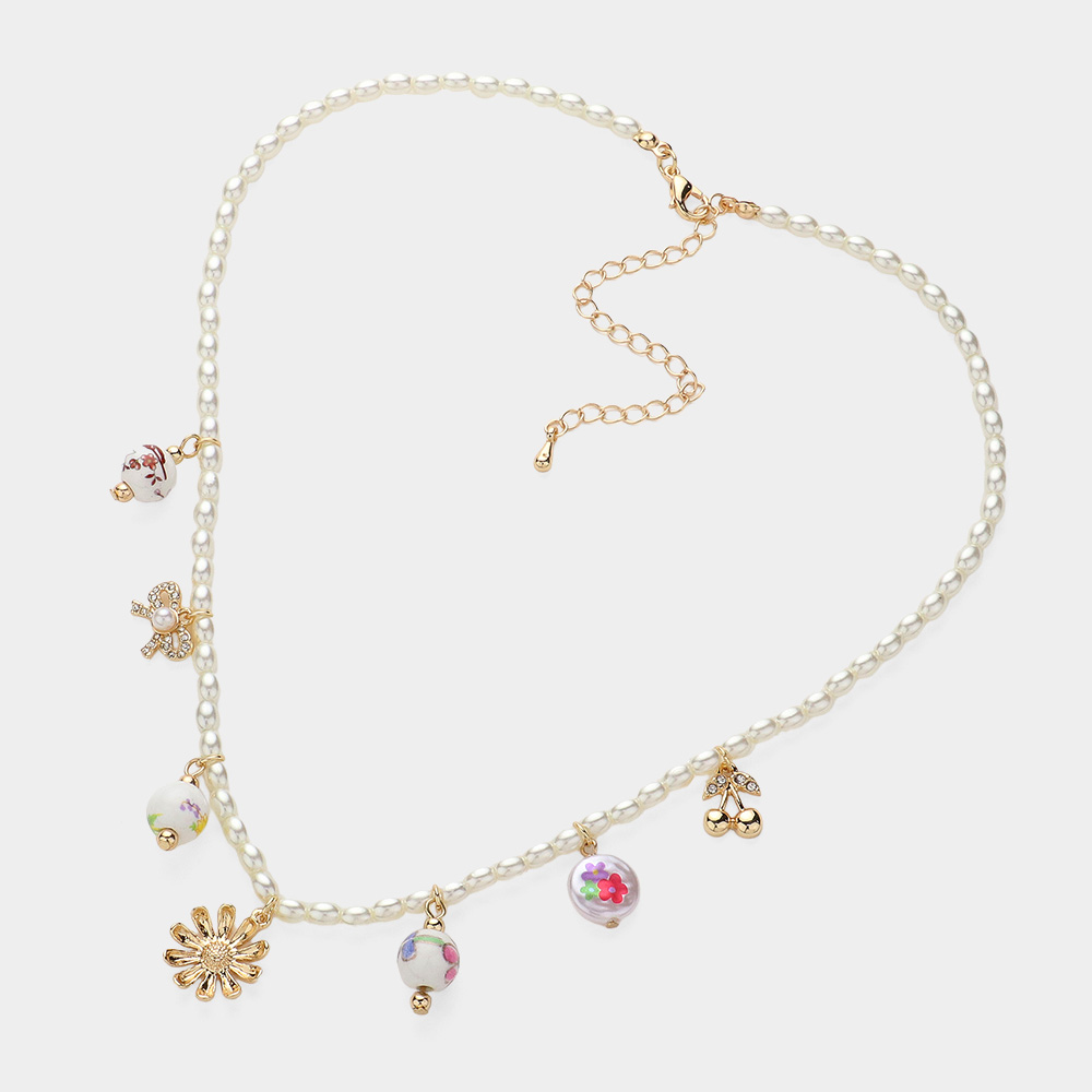 Pearl Bow Flower Cherry Charm Station Pearl Necklace