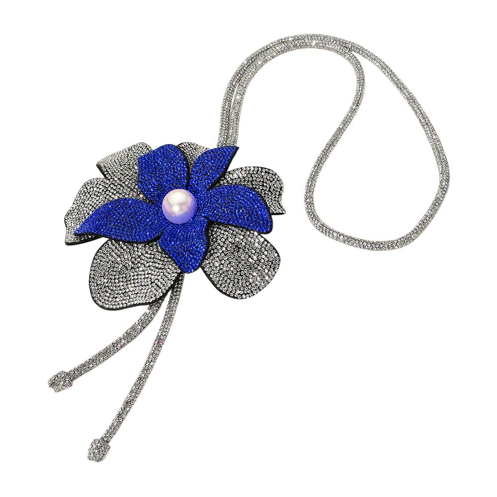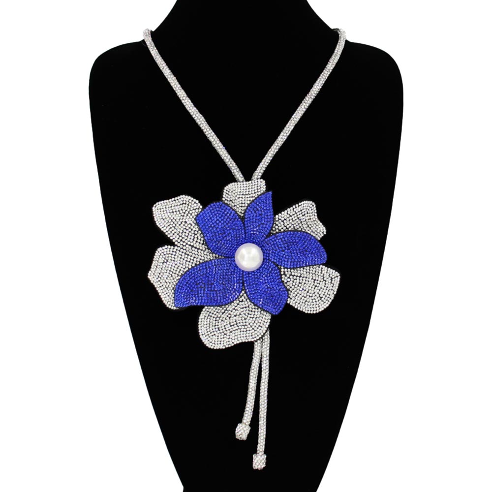 Pearl Centered Bling Studded Flower Pointed Bolo Tie Necklace