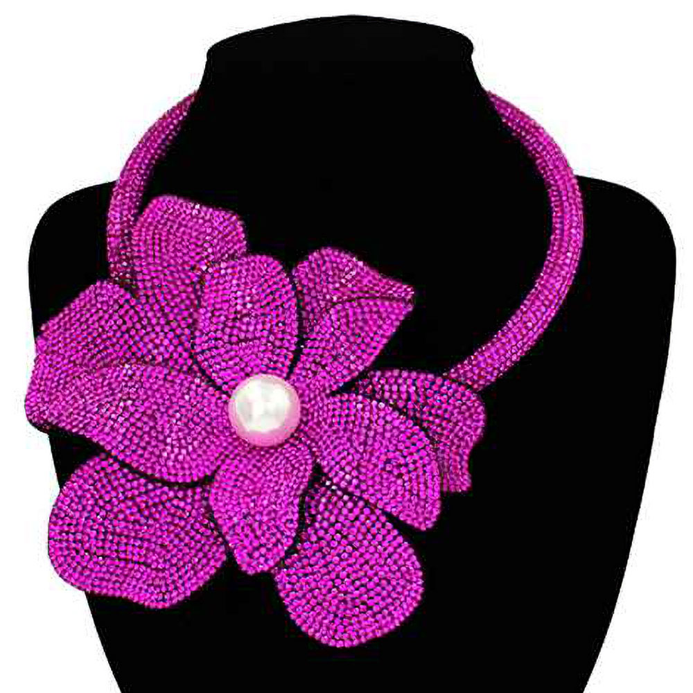 Details • Necklace Size : 17" + 3.25" L • Decor Size : 5" L • Turn heads with this bold statement necklace featuring a large beaded flower with textured petals and a pearl-like center. A striking accessory perfect for special occasions, themed outfits, or standout fashion moments. • Lead and Nickel Compliant