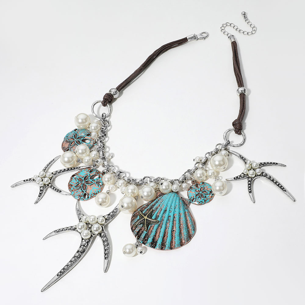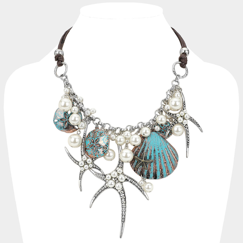 Pearl Embellished Starfish Shell Pendant Beaded Statement Necklace