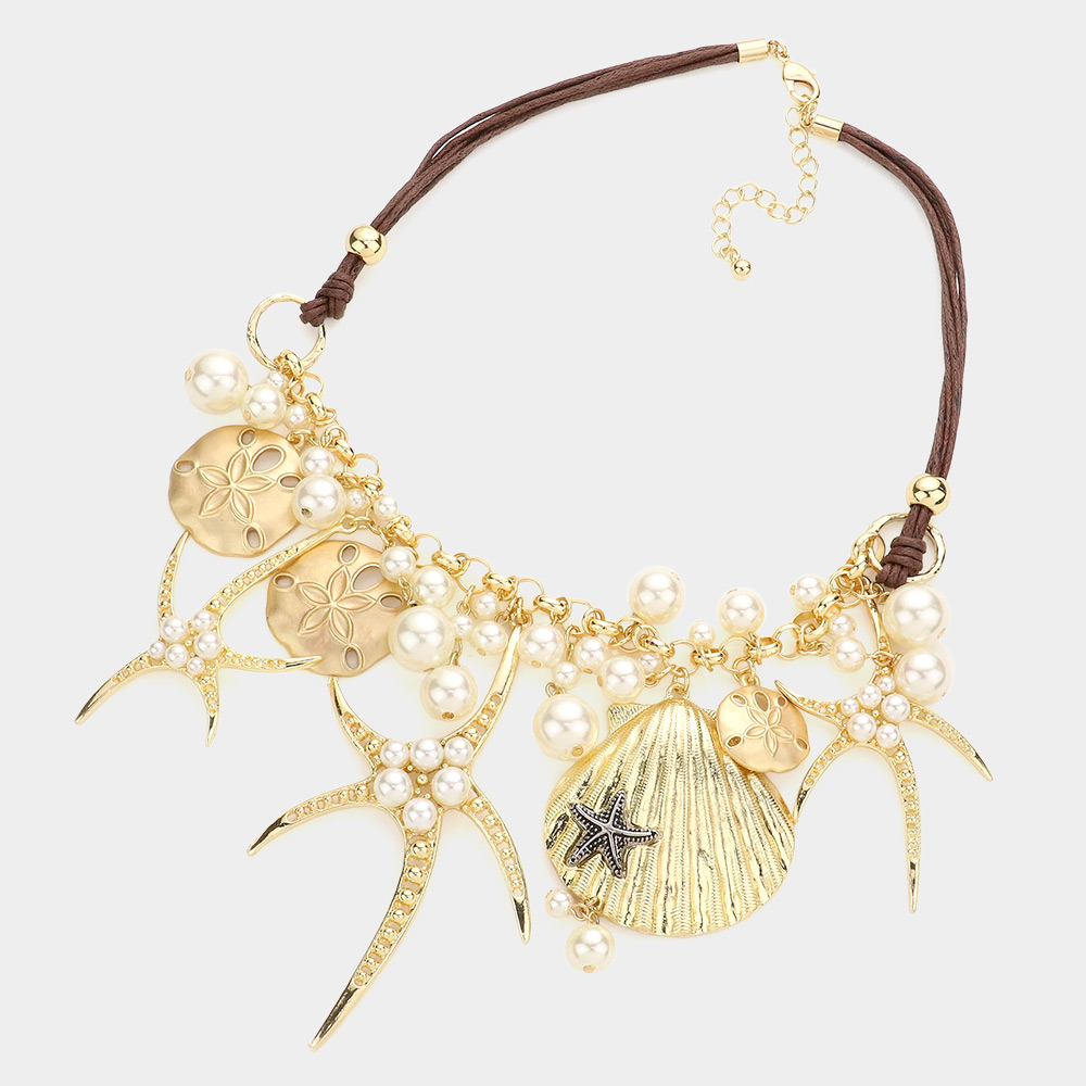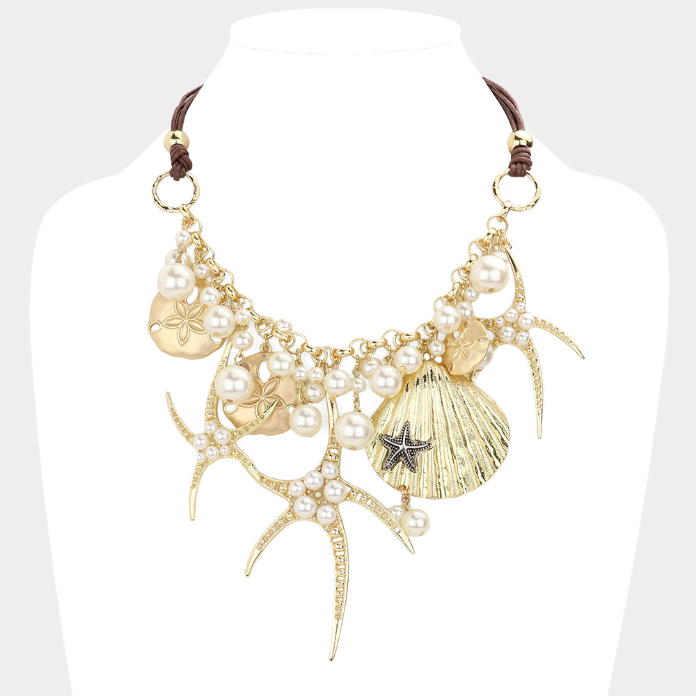 Pearl Embellished Starfish Shell Pendant Beaded Statement Necklace