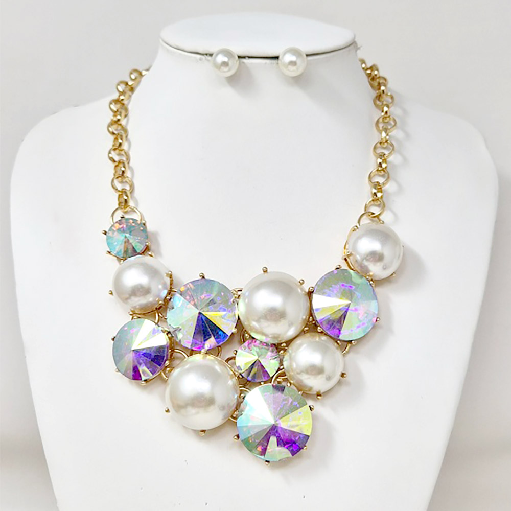 Details • Necklace Size : 19" + 3" L • Decor Size : 3.5" L • Earrings Size : 0.4" L • This elegant statement necklace features lustrous pearl-like accents paired with shimmering gemstones for a radiant finish. Complete with matching stud earrings, it offers a perfect blend of sophistication and glamour, ideal for weddings, galas, or upscale evening looks. • Lead and Nickel Compliant