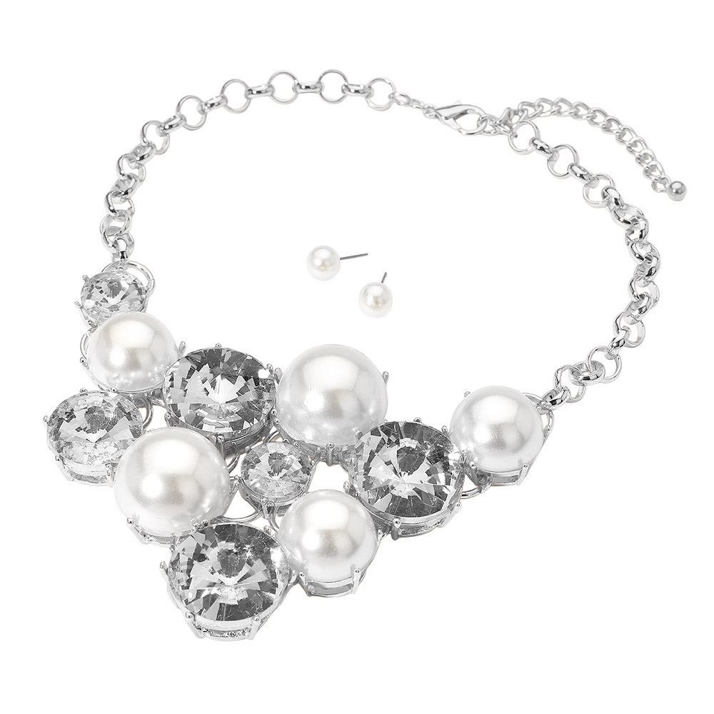 Details • Necklace Size : 19" + 3" L • Decor Size : 3.5" L • Earrings Size : 0.4" L • This elegant statement necklace features lustrous pearl-like accents paired with shimmering gemstones for a radiant finish. Complete with matching stud earrings, it offers a perfect blend of sophistication and glamour, ideal for weddings, galas, or upscale evening looks. • Lead and Nickel Compliant