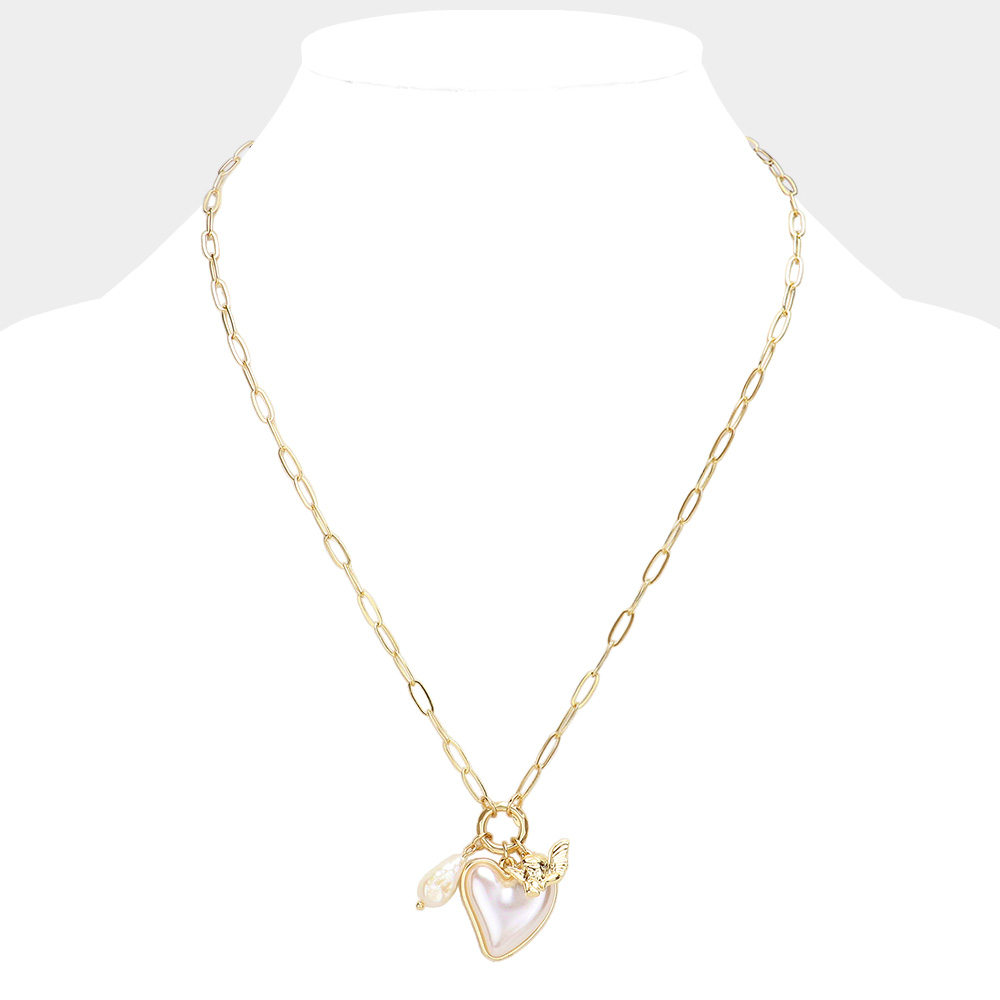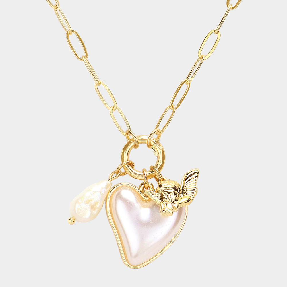 Pearl Heart Angel Charm Paperclip Chain Necklace
