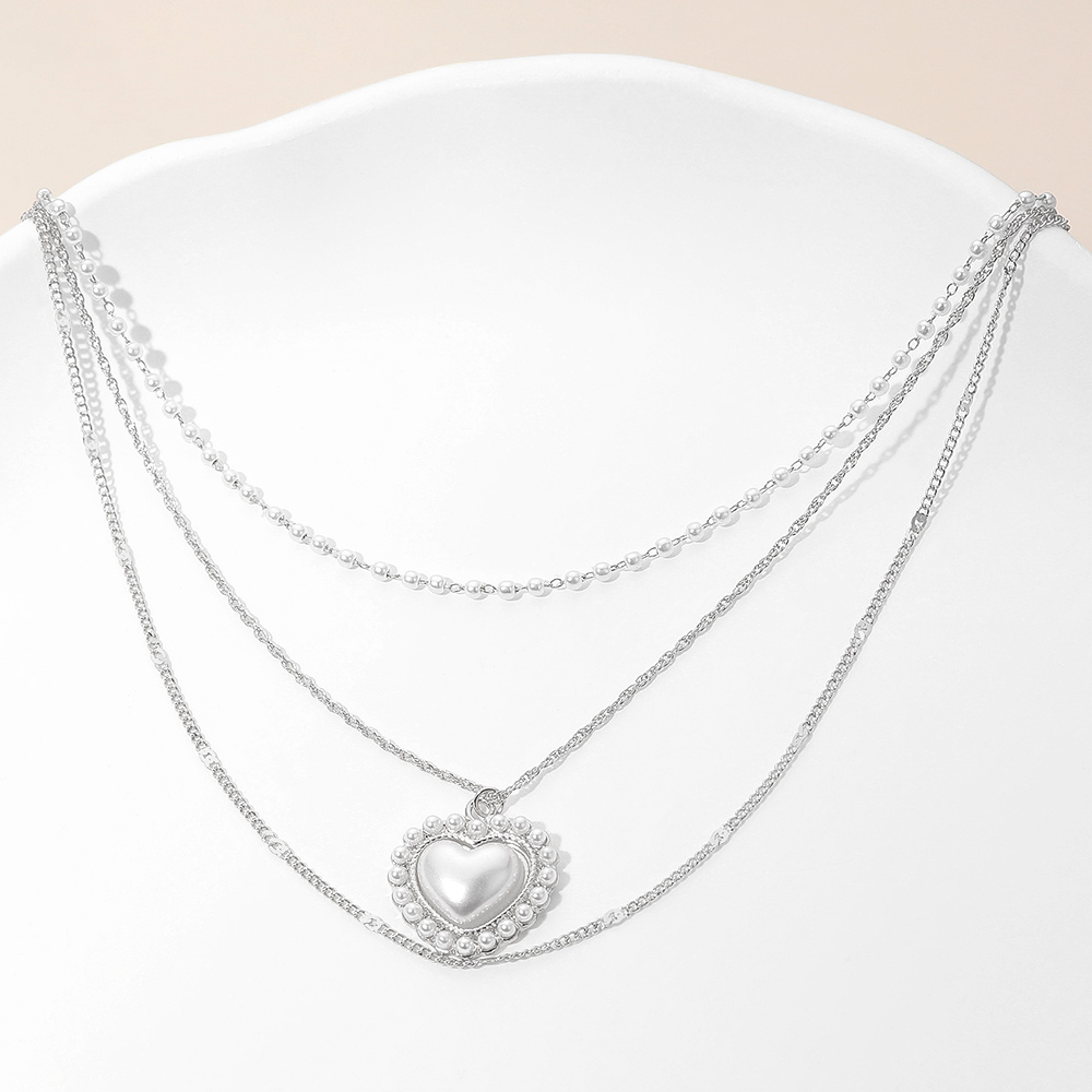 Pearl Heart Pendant Accent Triple Chain Layered Necklace
