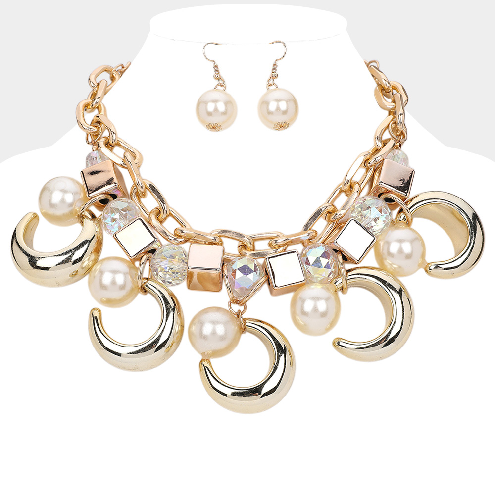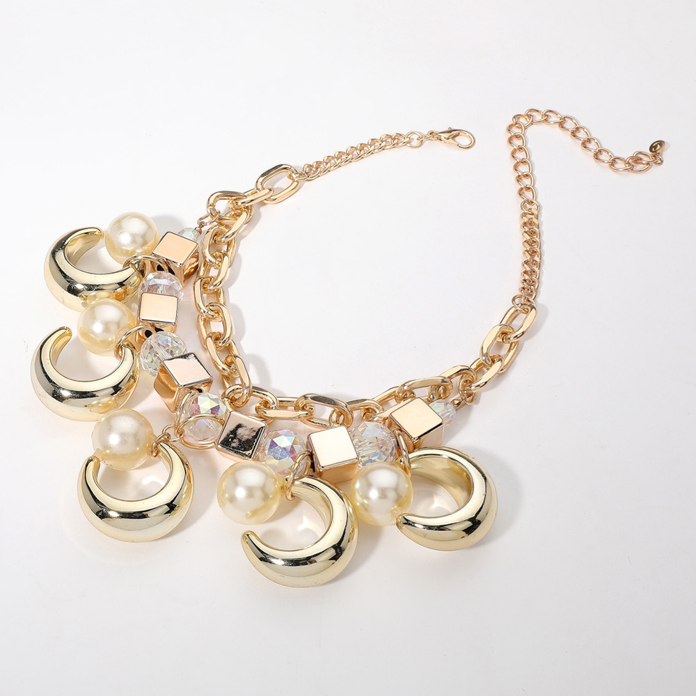 Pearl Metal Crescent Charm Station Abstract Chain Statement Necklace