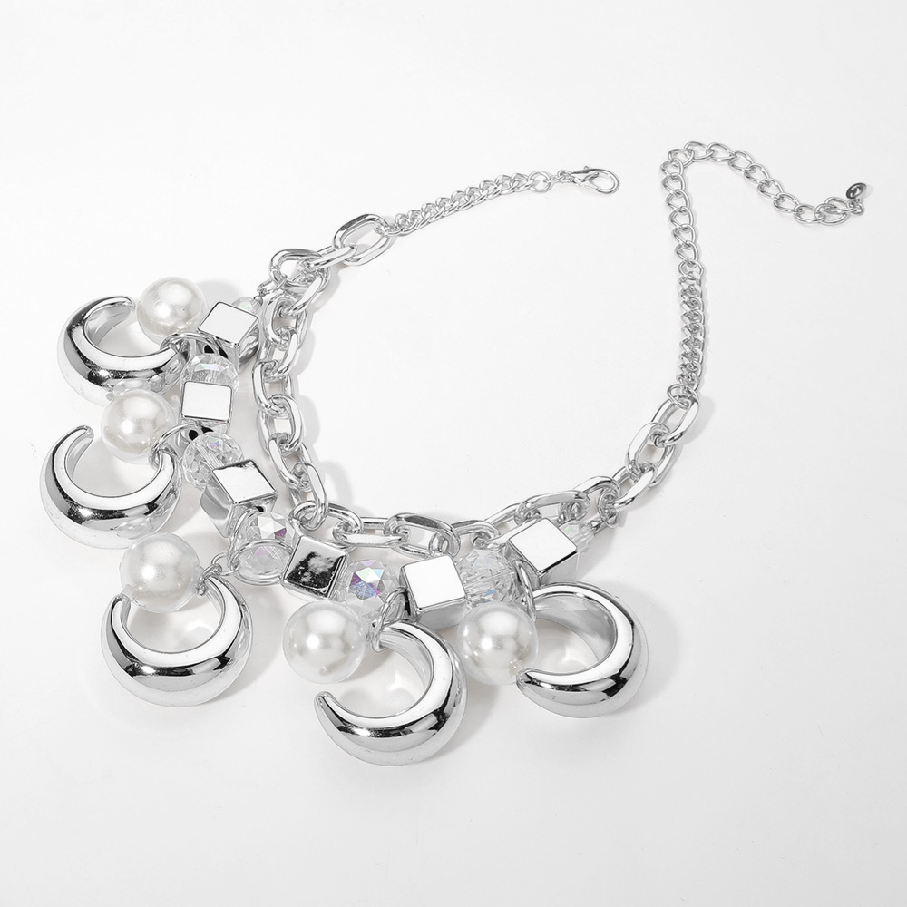 Pearl Metal Crescent Charm Station Abstract Chain Statement Necklace