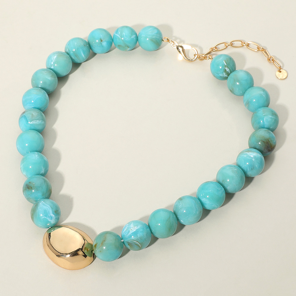 • Make a bold impression with this beaded statement necklace, featuring smooth round beads and a polished metallic accent. Perfect for elevating your style with a touch of artistic flair and modern charm.