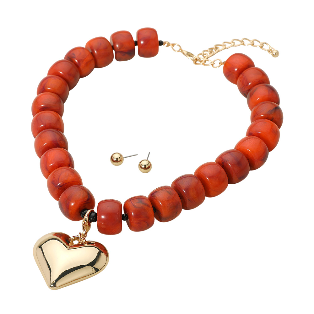 Puffy Metal Heart Pendant Chunky Beaded Statement Necklace
