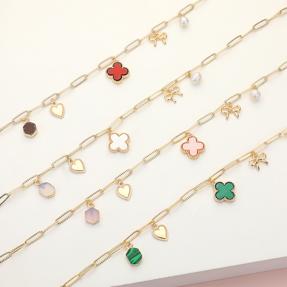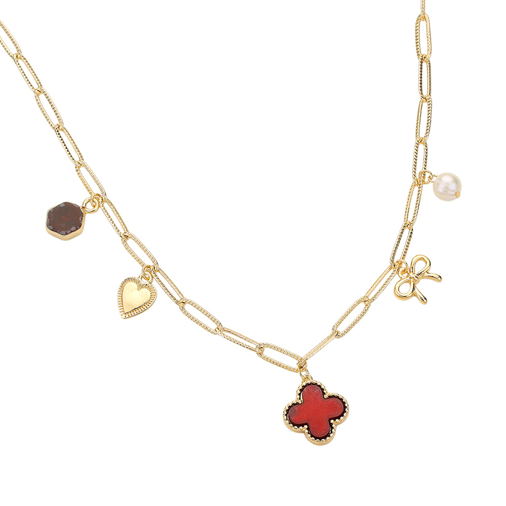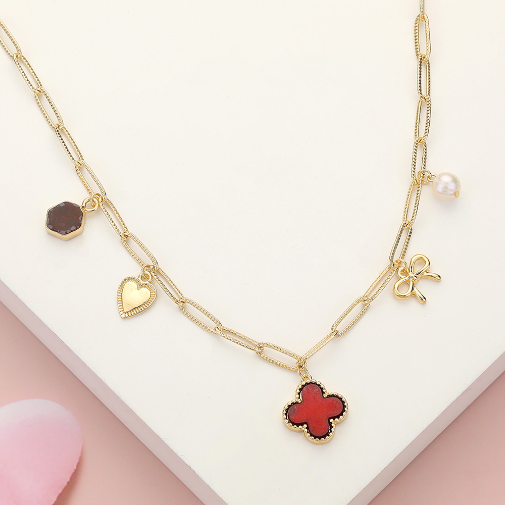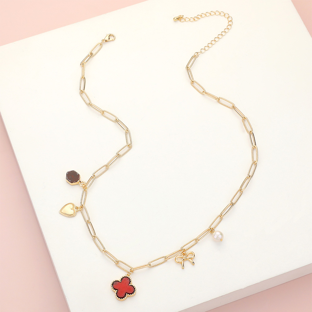 Quatrefoil Bow Heart Pearl Charm Station Paperclip Chain Necklace