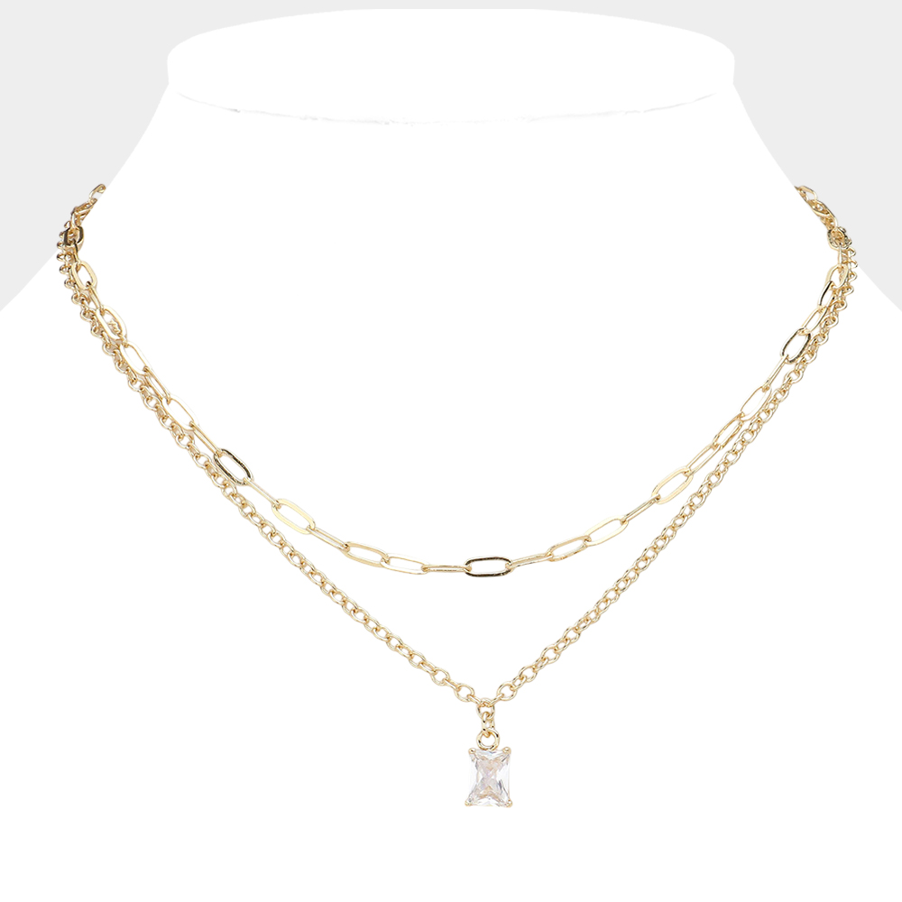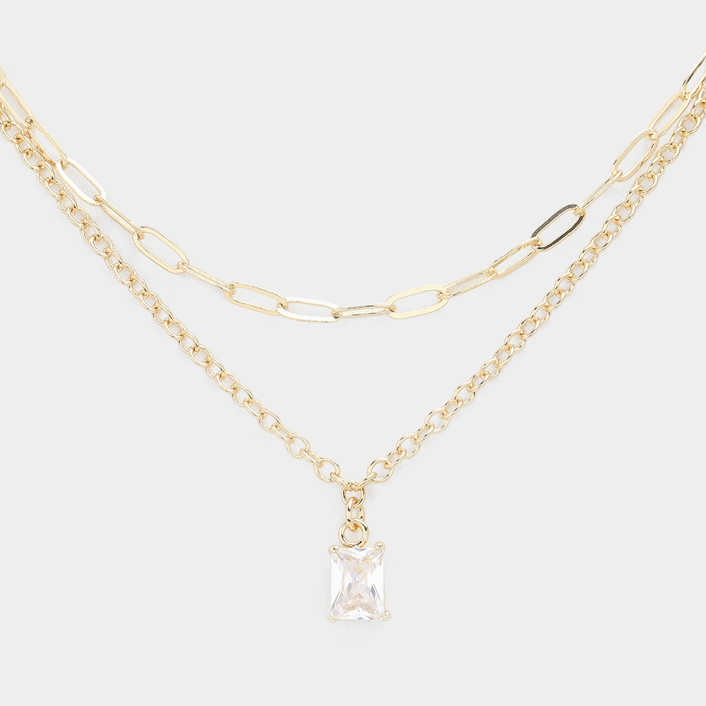 Rectangle Stone Cluster Pendant Double Layered Necklace