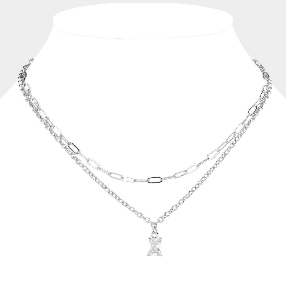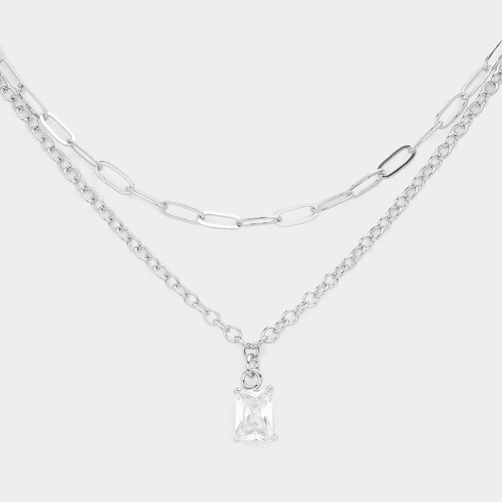 Rectangle Stone Cluster Pendant Double Layered Necklace