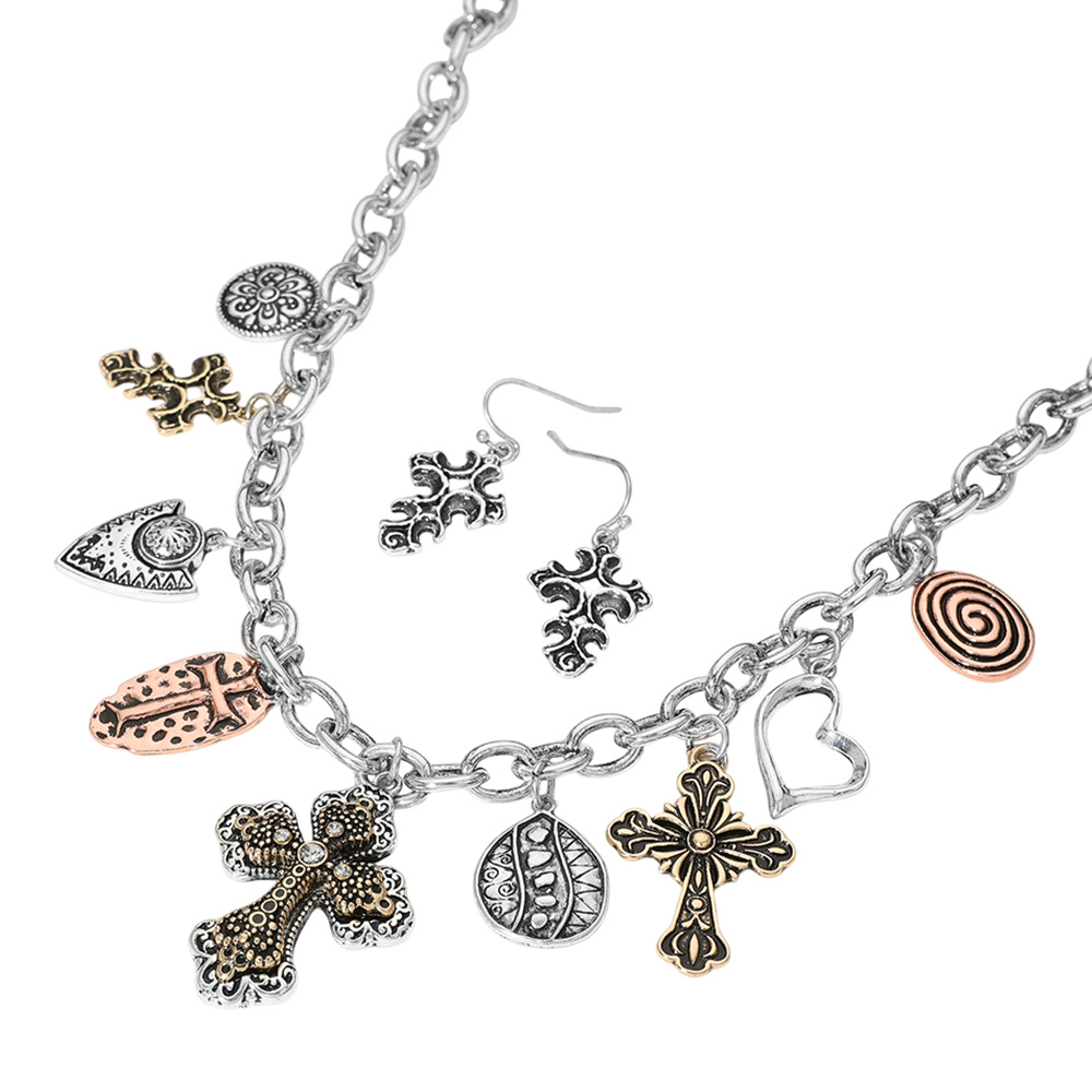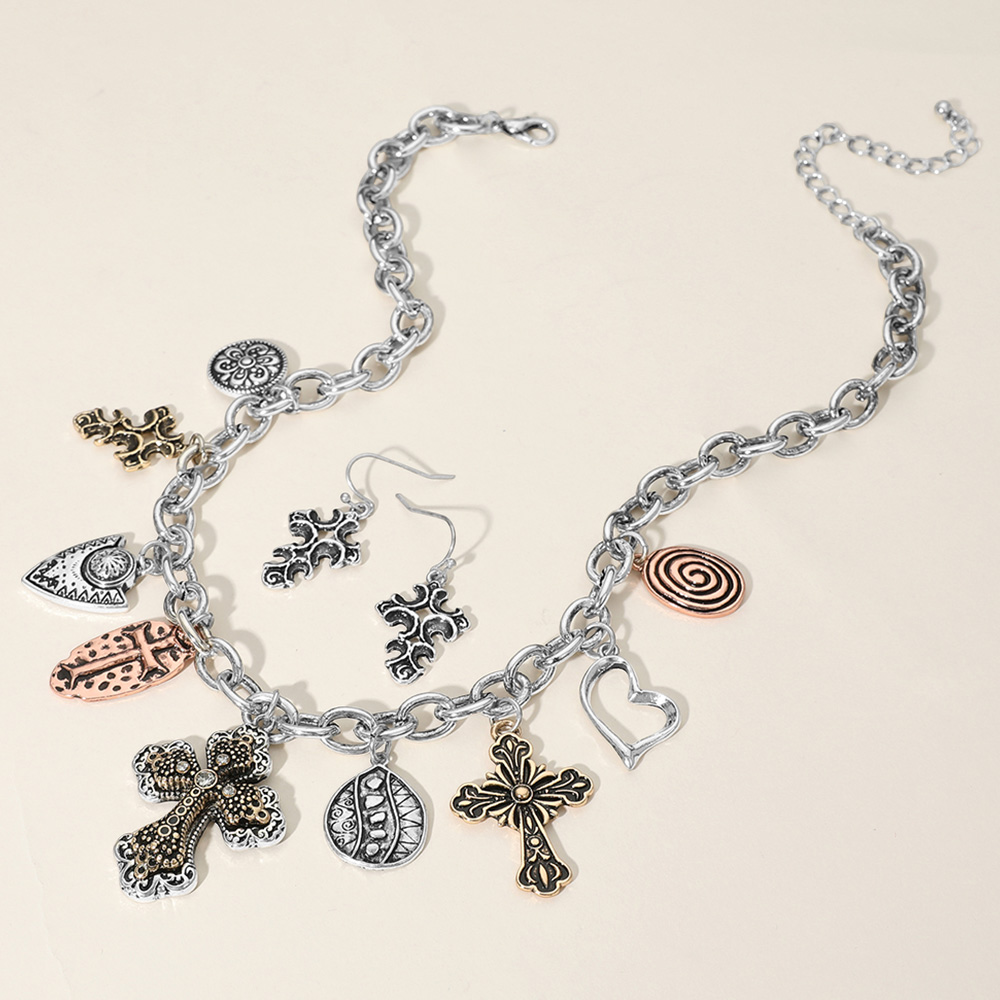 Hammered Metal Stone Paved Heart Cross Pendant Pointed Triple Layered Necklace